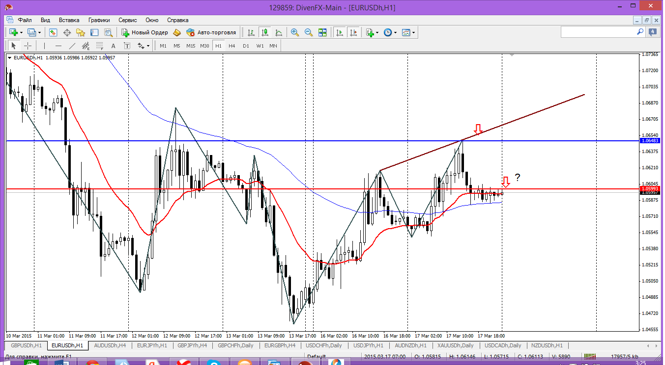 Сейчас, когда пара опустилась ниже уровня 1.06 опять по рынку активизировались бравурные высказывания продовцов о возобновлении нисходящей тенденции. Вполне может так в конечном счете и оказаться. Но сейчас ситуация внутри дня говорит об обратном (на Н1): зиг-заг явно прорисовали в северном направлении...сейчас цена опустилась на часовой мувинг сверху. Ситуация на покупку, но никак не на продажу... Прикрепленные файлы: