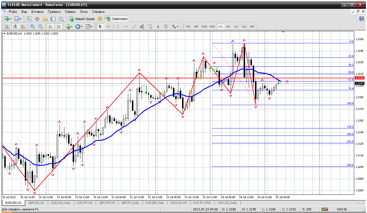Итак, 26.07. Евра... Сейчас у важного уровня топчемся - 1.33, сходу врядли пройдут. Нужно присесть и вот зона для покупок у меня получается 1.3245. Это и сегодняшний пивот и 38.2% откат вчерашнего роста. По ТА (у меня) выше 1.3320-3333 не должны пойти. Но... сегодня пятница. Надо быть готовым к любым сюрпризам. Прикрепленные файлы: