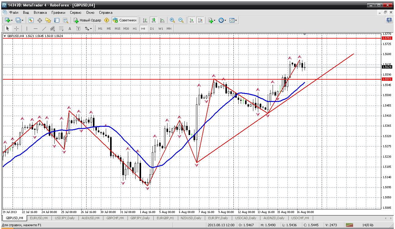 От фунта, приходиться ждать 1.5751. Раньше он не успокоится и не остановится. Если честно, я потерялся по этой паре на неделе. В прошлые выходные указывал на рост в район 1.5750, а со среды почему то перестроился на продажи (и все на более мелких ТФ). А цена ползла и ползла к указанным вершинам. Что нас ждет? Думаю возрат, но не глубокий, к 1.5555 (и мувинг на Н4 и трендовая), а потом и рост к 1.5751. А там и серьезный разворот цены Прикрепленные файлы: