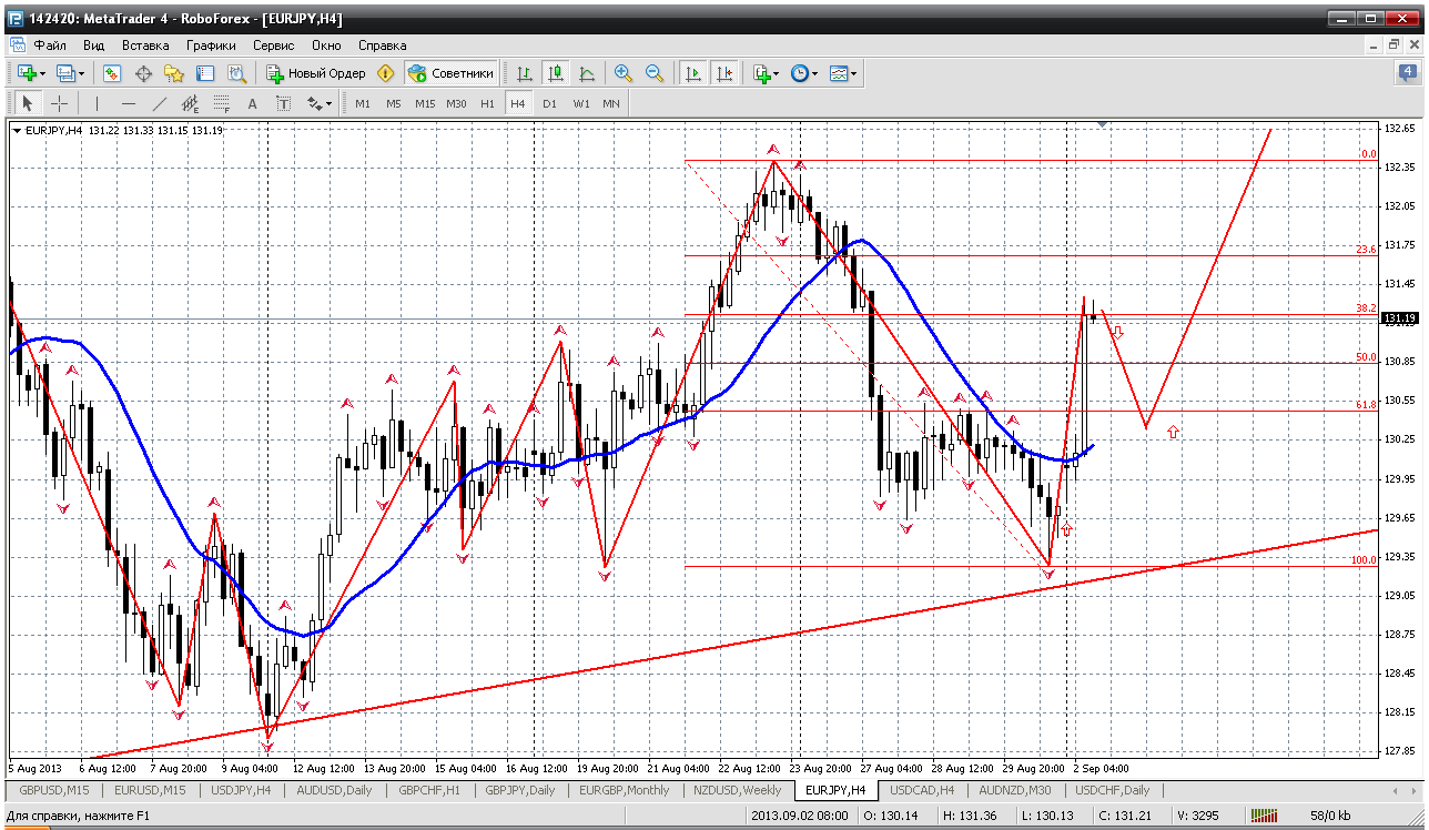 От своих продаж (от 131.30) не отказываюсь. Поведение цены к этому не способствуют. План таков: У кого нет продаж, можно подождать приличного сопротивления - 131.51 и продавать. И в середине фигуры 130 имеем две поддержки: 130.68 - первая, здесь фиксируем продажи; 130.24 - вторая. От неё открываем покупки. У меня так получается. Прикрепленные файлы: