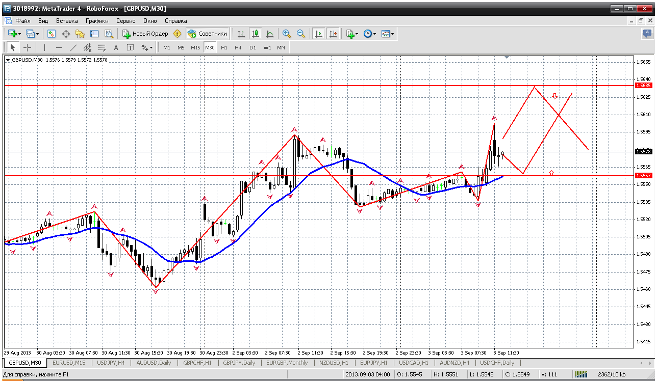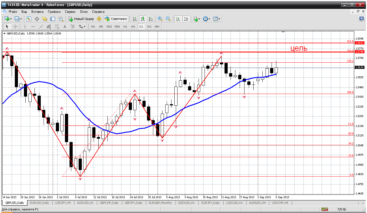 То есть видим, что цена закрепилась выше мувинга и имеет перед собой явную цель, предыдущую вершину зиг-зага 1.5715 и мы вполне вероятно получим вторую вершину, а уже там, на тех уровнях будем смотреть, что и как: пробивать будем или на коррекцию пойдем Прикрепленные файлы: