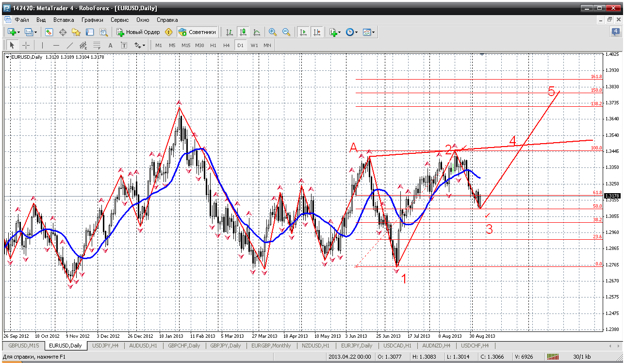 Итак, ДНЕВКА: Видим реальную волну 1 (от точки 1 до точки 2) и на прошедшей недели цена изобразила откат, волну 2 (до 50% - 1.3104) и тут очень вероятен вариант коррекции до 61.8% - 1.3020 и уже после этого возможно продолжение роста либо до трендовой линии (точка 4 - 1.3482), либо рост до уровней фиборасширения - точка 5, а это уже выше 1.37. Как то так получается Прикрепленные файлы: