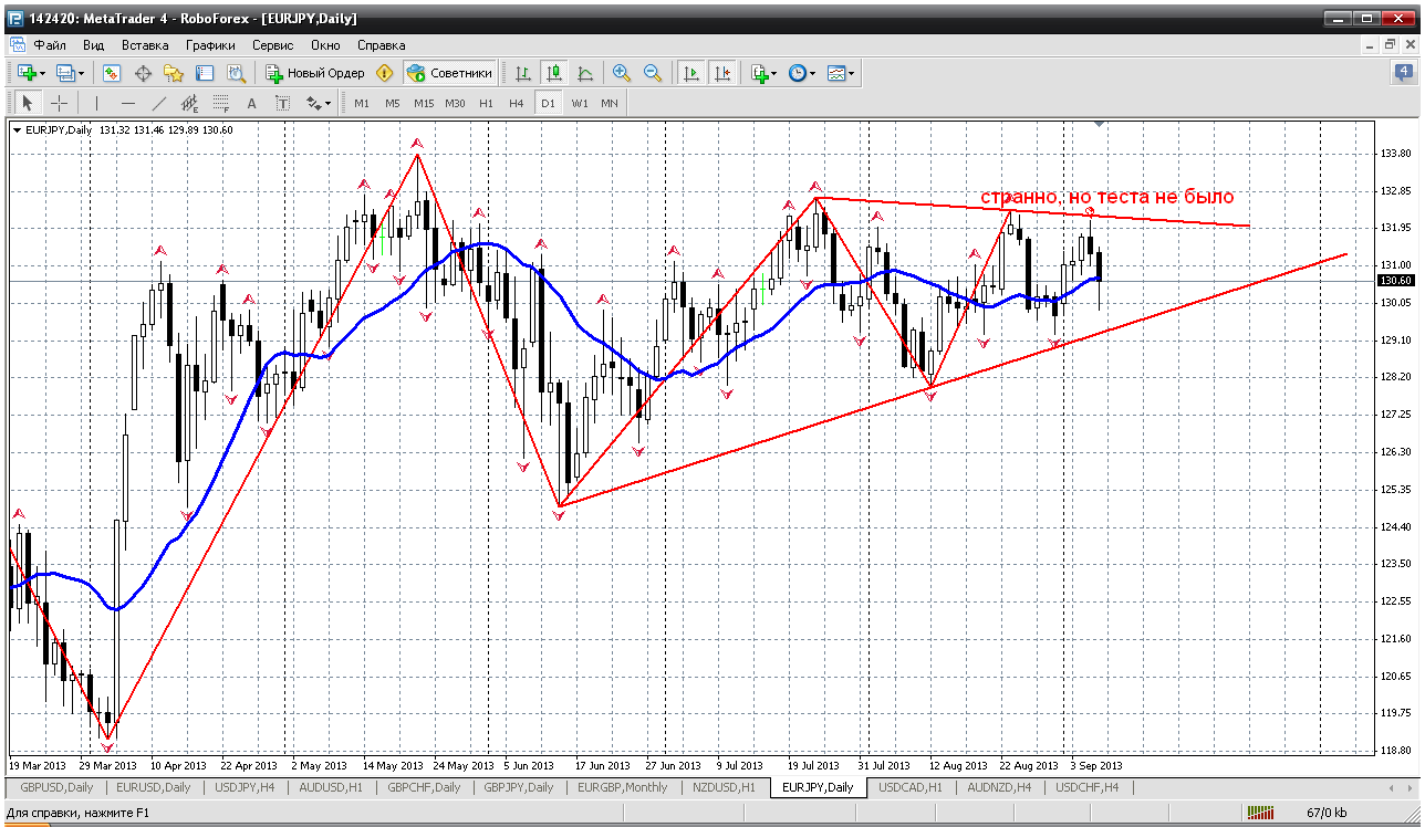 Евройена... цена зажата в узких диапазоне, чуть больше 300 пипсов. И вот что у меня получается на дневке. Диапазон всё уже и уже и при этом цена уже даже не отрабатывает границы этого диапазона (сверху остался не протестирован уровень 132.45), а снизу граница проходит в районе 129.10. И когда пошли ниже 130 в пятницу, ну все, думаю, не жди теперь 132, но мувинг все же вернул к себе цену. А сейчас цена практически в середине этого диапазона, с одинаковыми шансами уйти и вверх на штурм неотработанного 132.45, а так же сразу пойти на тест 129.10 Прикрепленные файлы: