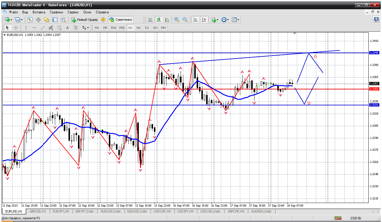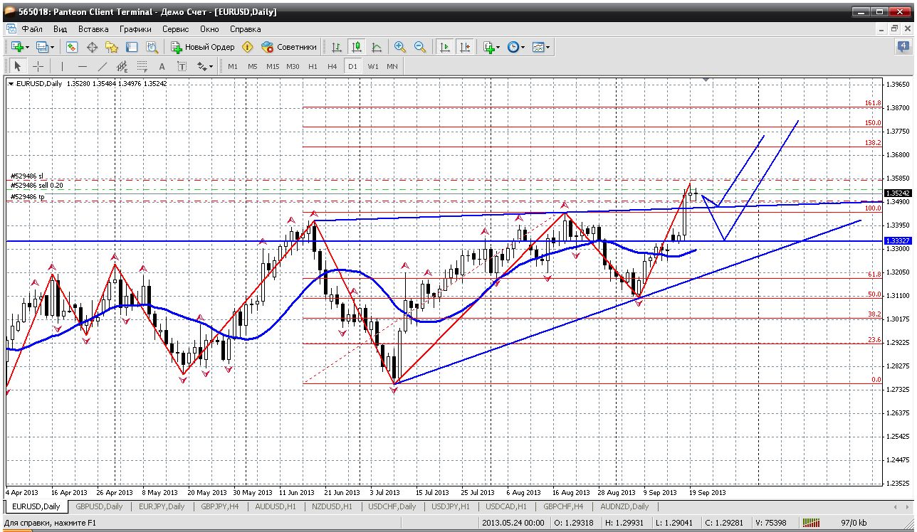 Последняя пара ветки - евройена. Давно жду снижения, стою в продажах от 133.80 Но на дневном графике евройены просматривается еще ход вверх хоть до 137... 135.60 как минимум....но вот покупать на этих вершинках я точно не буду пока. Лучше посмотрю со стороны, поднимется в 135 фигуру, добавлю продажу. Вот такой план на неделю. Прикрепленные файлы: