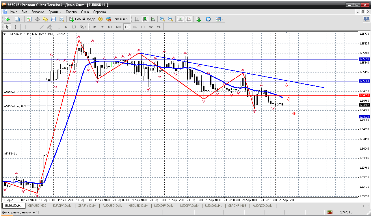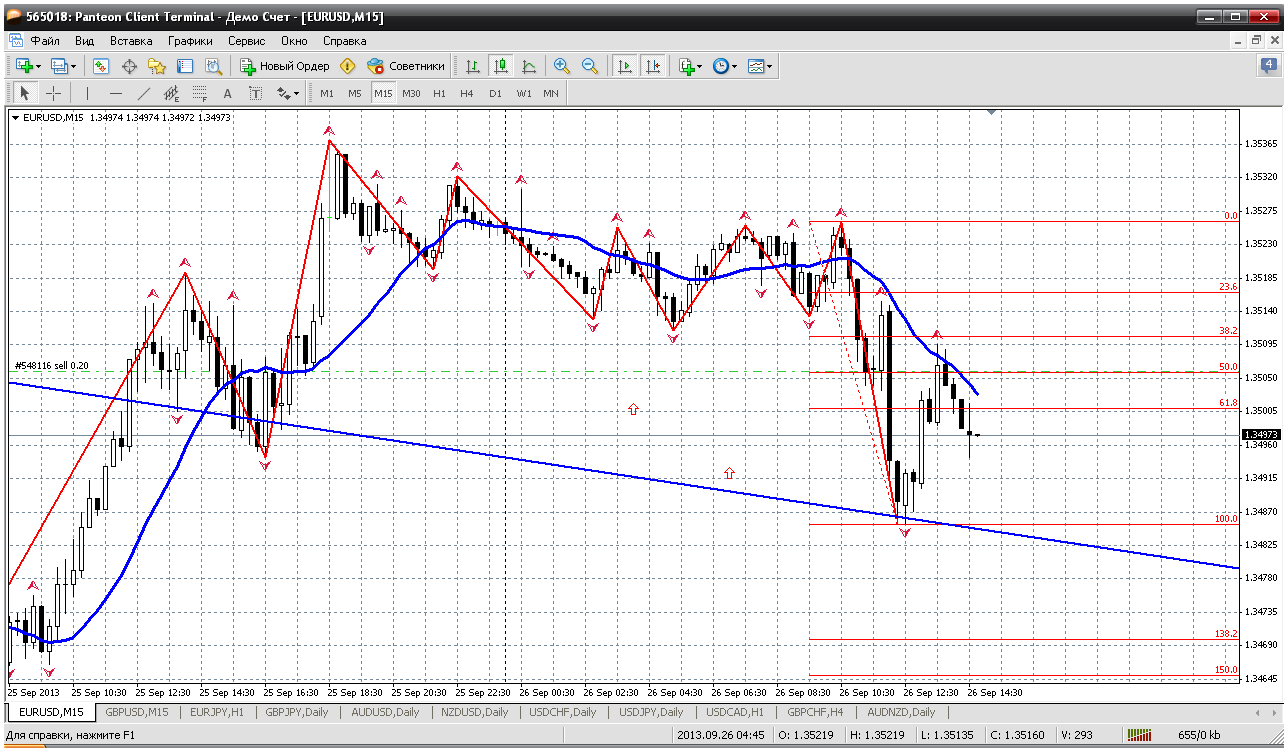 Ситуация по евре опять изменилась. Вчера продавал от 1.3506, сегодня с утра планировал бежать из продаж хотя бы в нолях. Потом не был у терминала, а сейчас ситуация такова, что уходить из продаж, на мой взгляд, глупо. На М15 цена хорошенько сходила вниз,потом откорректировалась на 50% к мувингу и теперь путь на 1.3480, а то и 1.3470 открыт. Продажу держу Прикрепленные файлы: