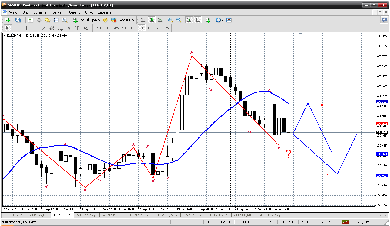 Посмотрел под вечер на наши пары. И евройена...вот что бросилось в глаза. Вроде неплохо продалась пара сегодня, но свои цели по снижению (коррекции) еще не выполнила. Не дошла даже до ближайшей цели. А это возврат к мувингу на дневном графике. На сегодня это был район 132.20. Не дали. Значит будет еще попытка. Прикрепленные файлы: