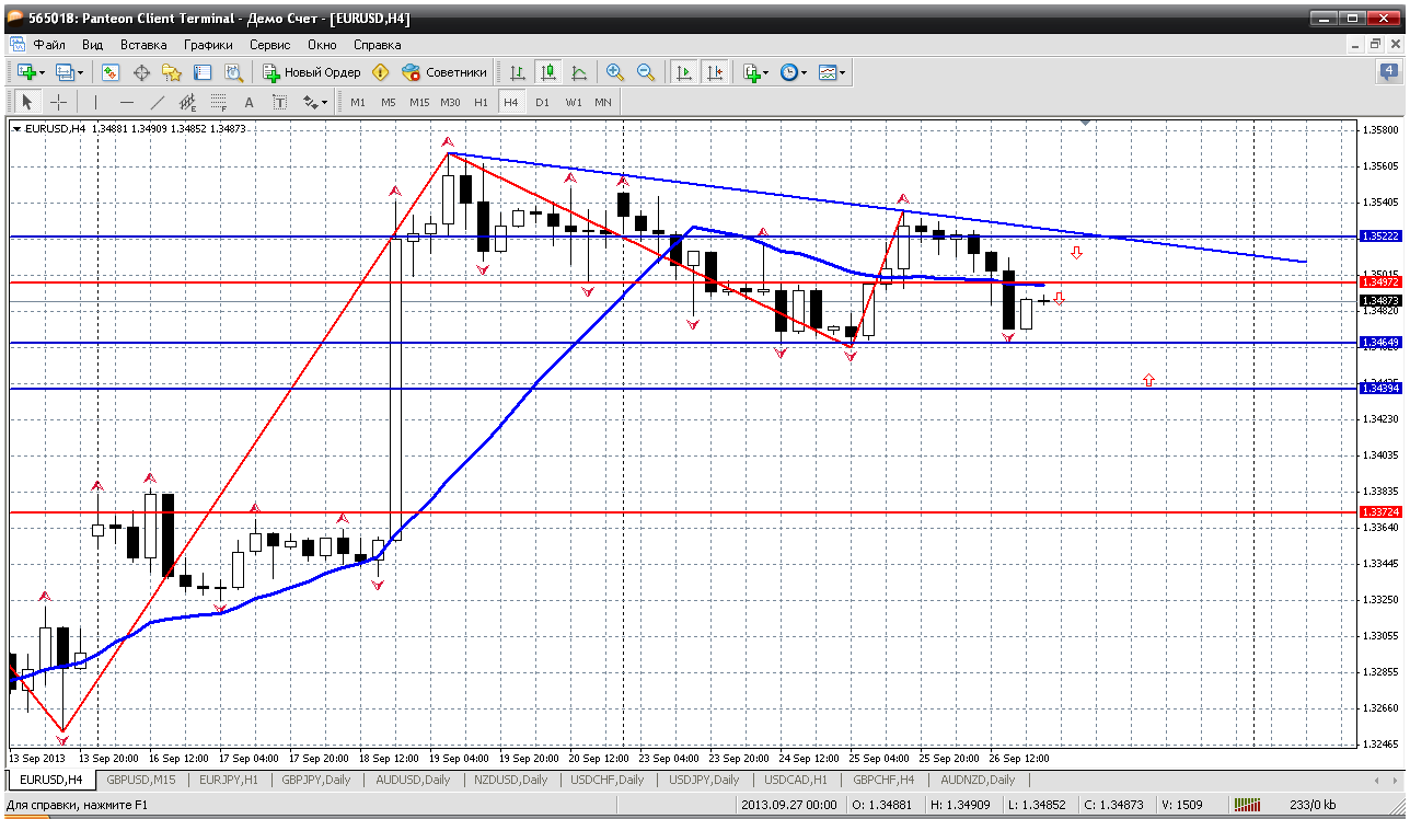 Евробакс на 26.09....вчерашний резкий от 1.3462 до 1.3537 сильно изменил картину па паре на Н1. Цена выше трендовой на часе, которая теперь серьезная поддержка, как и уровень 1.35, там же у нас и пивот. План таков: на тех уровнях (1.35-1.3508) кроем все селы. И можно начинать покупать от 1.3499 (50% отката вчерашнего роста).