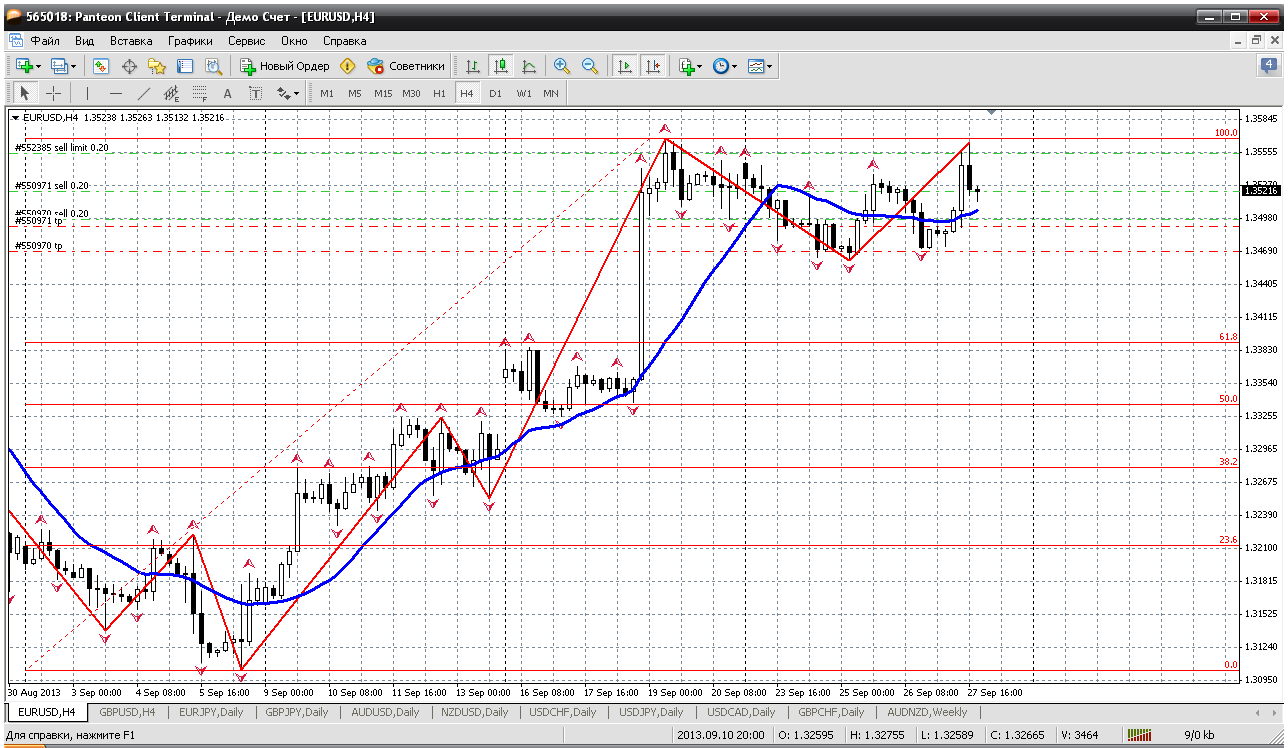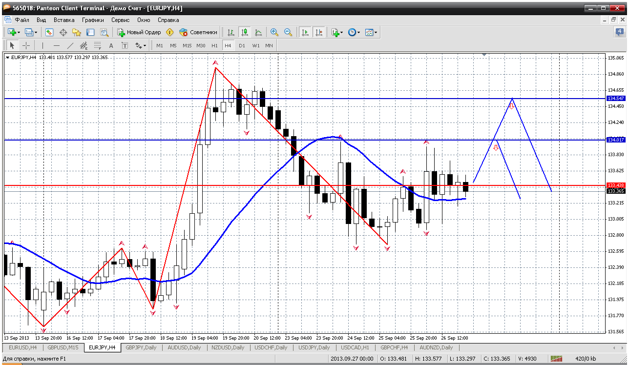 По евройене сделал пару продаж от 133.18 (вчера) и 133.78 сегодня. Но вот за сегодняшнюю первую половину дня картина на Н1 была перерисована (это мой график, по которому принимаю решение для этой пары). Итак, сейчас две продажи от 133.18 и 133.78 буду закрывать. На этот самом Н1 перерисовалась картинка и теперь канал получается восходящим. Поэтому получив неплохой профит по этой паре выхожу из сделок и сажусь "на забор". Прикрепленные файлы: