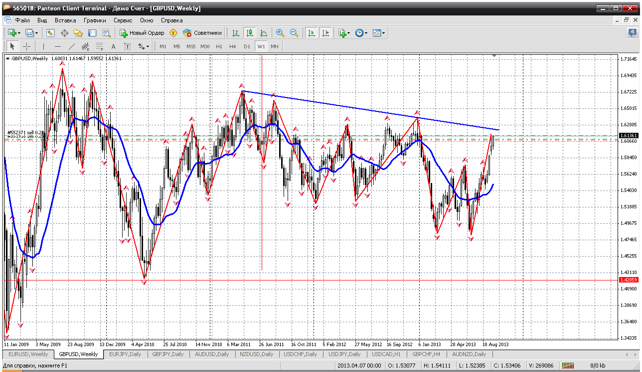 И чтобы увидеть возможные цели или хотя бы заминку в этом росте глянем на недельный ТФ. Очень древняя и значит сильная трендовая простирается от апреля 2011 года. И до её теста совсем чуть чуть осталось. Получается тест 1.6210 1.6230. И все, идем на разворот или хотя бы на коррекцию. Может так, посмотрим Прикрепленные файлы: