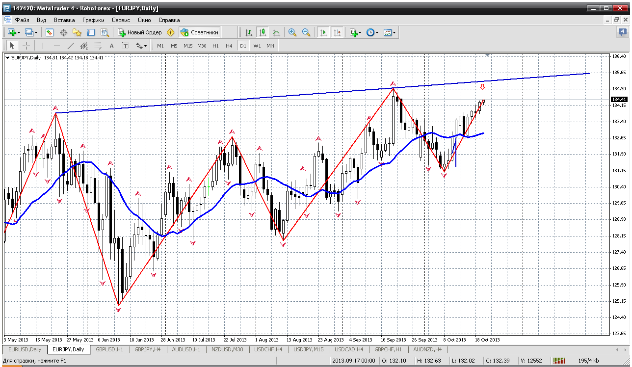 Евройену на дневке продаем. Уж очень 133.80 серьезным сопротивлением смотрится. Хотя и есть цель сверху: тест дневной трендовой. А это выше уровня 135. Но все таки пара выглядит как то тяжело и уровень 133.80 ( хай года до 19.09.2013) не пускает пару выше. И на дневке продажи можно открывать хоть с открытия рынка, 134 уже могут и не дать. Ближайшая цель 132.75 (возврат к мувингу). Прикрепленные файлы: