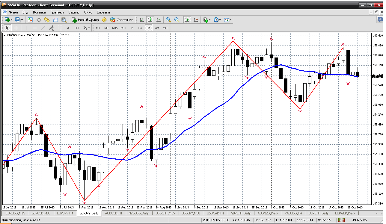 У евройены на дневном графике путь один, на юг. Я так думаю, может и ошибаюсь. А вот почему: пара вроде движется в канале и канал восходящий. И после тестирования его верхней границы и установления нового максимума годового 135.50 пара пошла вниз. И если уж не ждать теста нижней границы канала, то хотя бы спуститься к мувингу надо бы. А это цена 133.20.... и вот там у меня и получаются ближайшие цели этой пары.... Прикрепленные файлы: