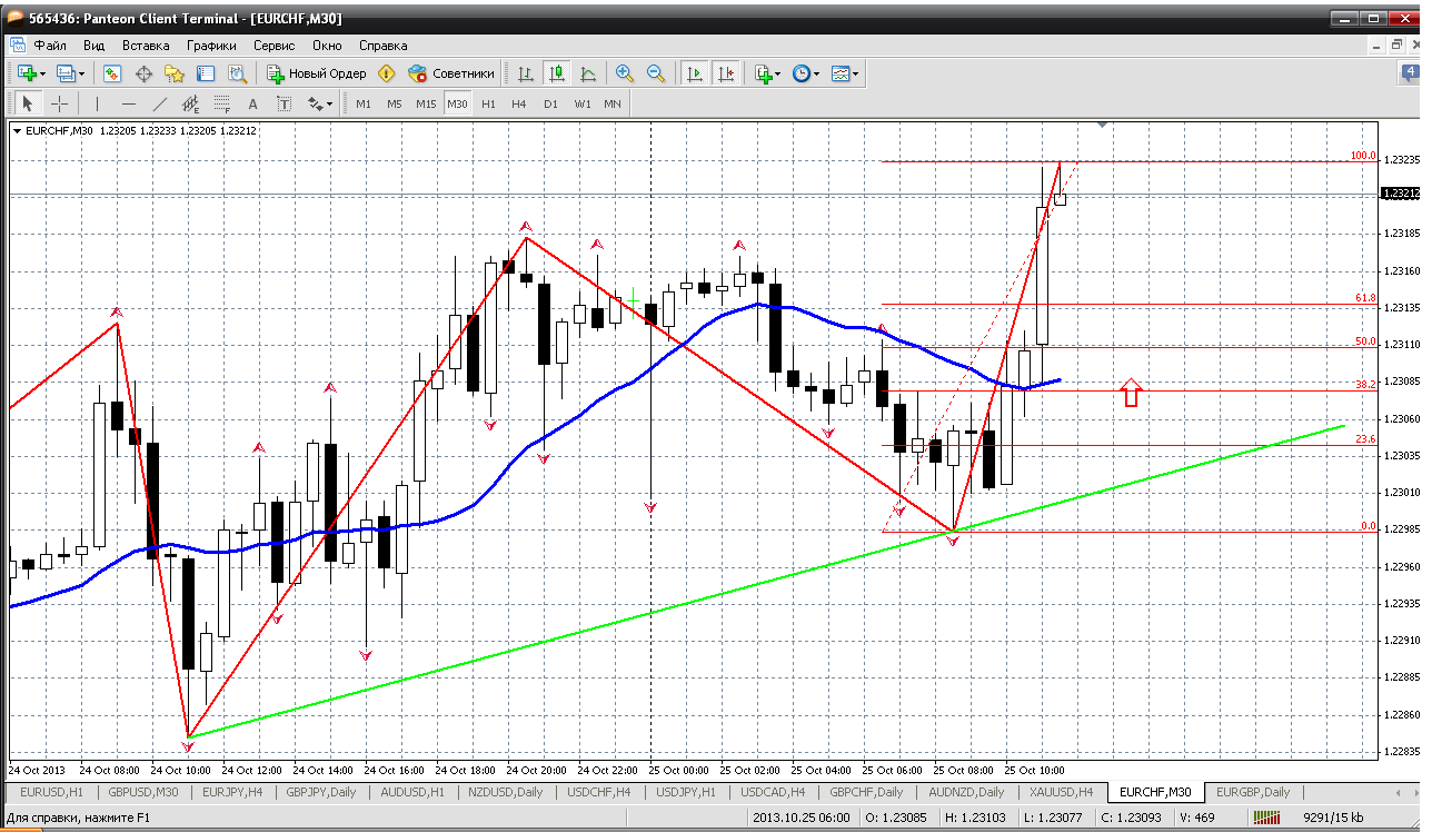 Евробакс...25.10. Елы-палы. Никак не успокоиться, и, наверное, продолжит тренд на севера. День закрыла уже в фигуре 1.38 и с утра обновлен вчерашний хай. И теперь при откате надо бы покупать. 1.3797 (пивот сегодняшнего дня), там же у меня и мувинг на Н1 изогнут на повышение. Так что при возврате к этому уровню - покупаем.