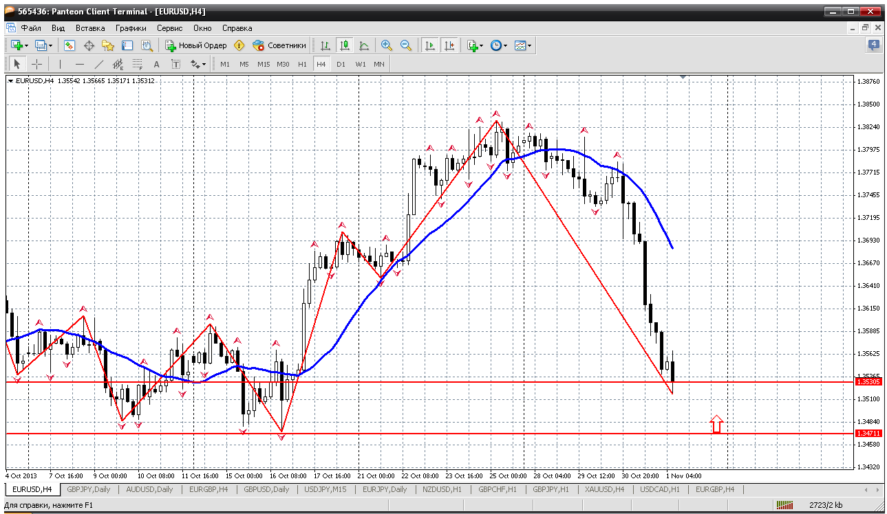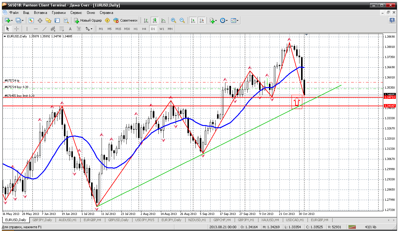 На этом ТФ очень хорошо видно, что фигура 1.34 является очень серьезным барьером, в ней заканчивался рост (две вершины видны - 1.3416 и 1.3452). В ней же, в фигуре 1.34 на уровне 1.3473 закончилось паследнее падение. То есть получается зона 1.3416 - 1.3473 серьезная очень, из которых покупки будут довольно обоснованы. Тут и трендовая на дневке тоже удержит цену от сильного падения. Вот такие мысли на этом графике. Прикрепленные файлы: