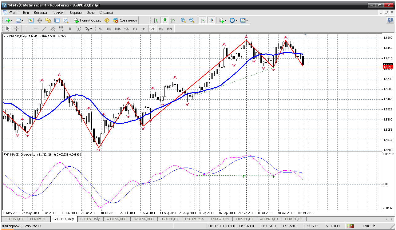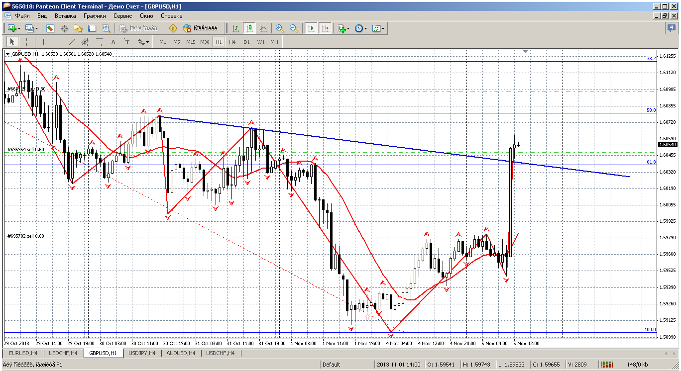 Сегодня, 5.11 хочется начать с фунта... Потому что, то что вытворяет эта пара внутри дня иначе чем движение с признаками истерии и не назовешь. Пробили все расчетные сопротивления, пробита трендовая на часе (при этом новостной фон довольно спокойный)....остался уровень 1.6077, там же 50% отката по фибо на Н4....попробую еще разок продать, но после 1.61 (ценой закрытия часа) все продажи ликвидирую.....это уже будет что то не понятное Прикрепленные файлы: