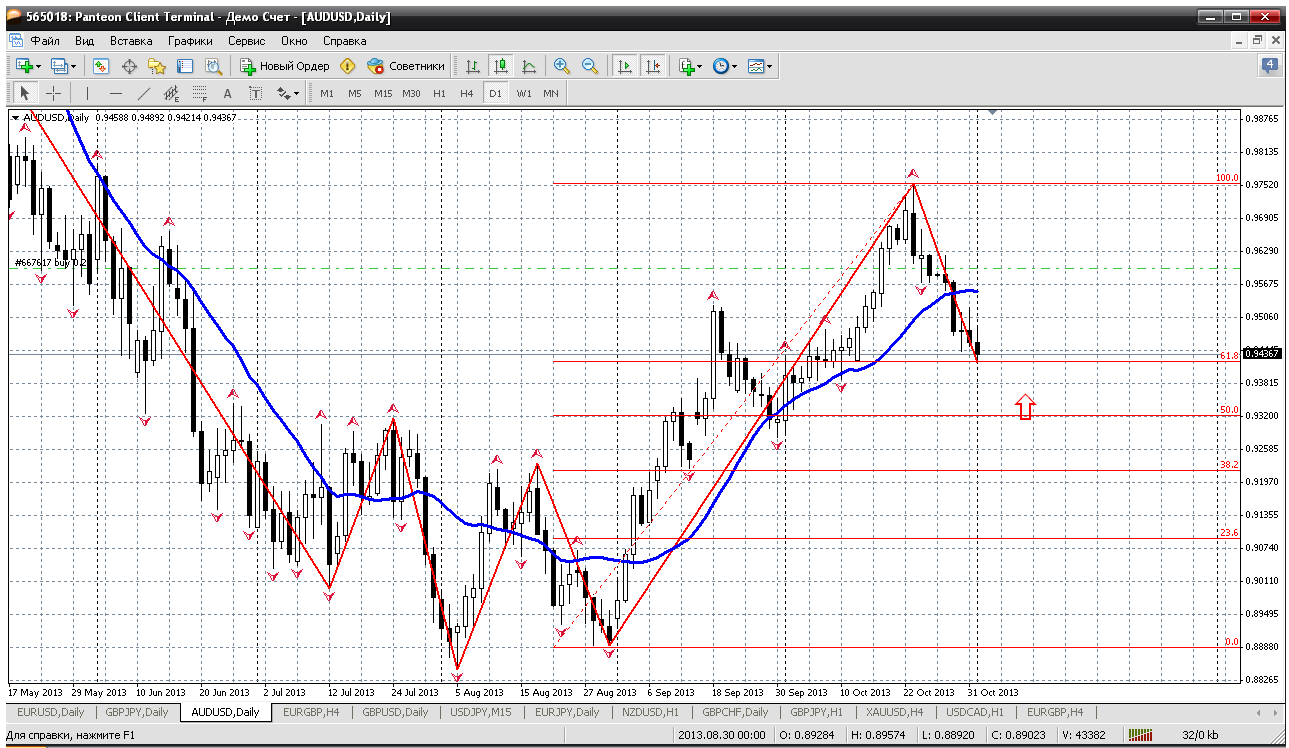 Австралийский доллар продолжил снижение. Пара достигла уровня 38.2% отката по фибо. Но о покупках пока думать рановато, а хотя бы дождаться отката до уровня 50%, 0.9323 и в том районе искать возможность открыть длинную позицию. При этом вполне реально рост может быть довольно продолжительным. Прикрепленные файлы: