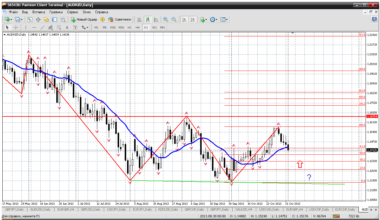 Австралиец - НЗД. Вот к этой паре обращаюсь иногда, очень она своим трендом интересна, все жду, когда этот тренд закончится. Но тренд на снижение никак не может хоть чуток притормозить. Взглянем на дневку. Вроде приличный рост шел с 1 октября, но даже предыдущую вершинку (1.1659) не протестировали и пошли вниз. Можно попробовать покупать от 1.1333 (61.8% отката по фибо), что то в тест дневной трендовой я не верю... Прикрепленные файлы: