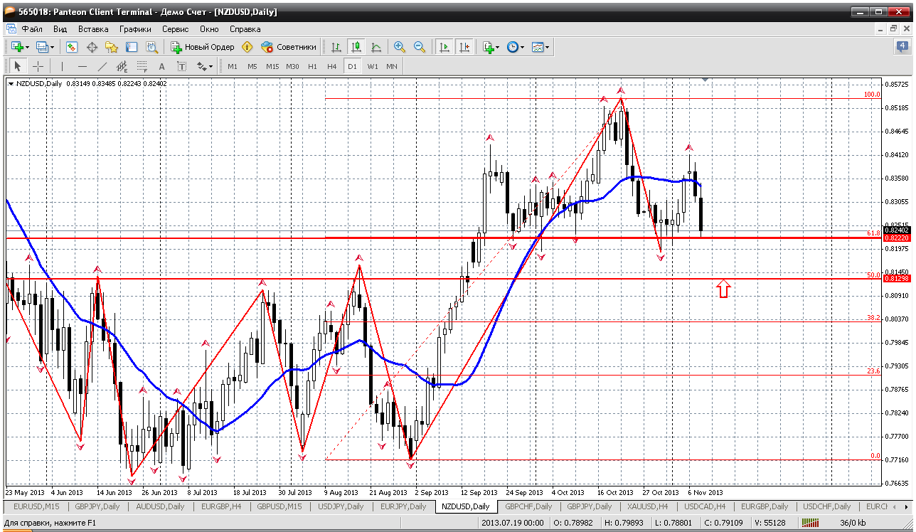 Когда НЗД закрепился выше дневного мувинга, я уже думал, что улетим значительно вверх. Но общее укрепление бакса, не оставила в стороне и эту пару. НЗД рухнул и в который раз сверху протестировал 0.8220 (сейчас это откат 38.2% по фибо на дневке). Но и раньше этот уровень не пускал цену ниже. Но сейчас, думаю, что всеже пробьют и пойдут к 0.8128. Когда то это было сильным сопротивлением, а сейчас приличная поддержка. Да и по фибо это 50%....А уж оттуда снова в рост... Пока так. Прикрепленные файлы: