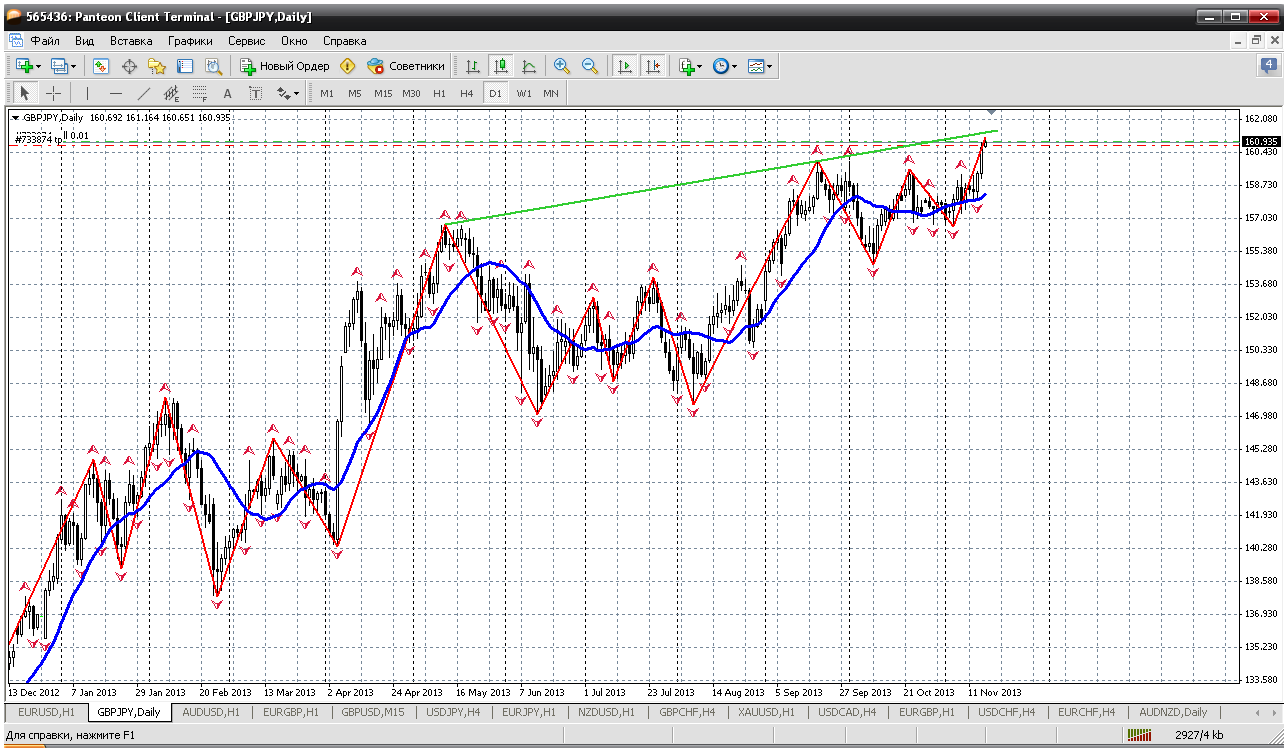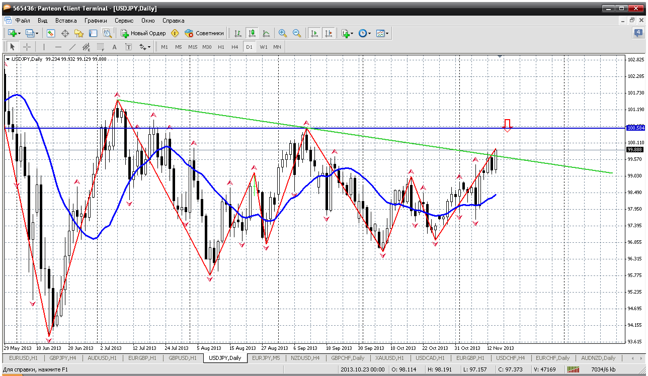 Последняя пара из йеновых, вроде как основная. Долго стояла около трендовой на дневке (с силами собиралась) и сегодня дружно так все йеновые пары пробили важные уровни и устремились вверх. По данной паре на уровень 100 я бы не стал особых надежд возлагать. Скорее всего и его тоже прошибут. 100.60 предыдущий локальный максимум. Вот пока цель роста. Можно оттуда и продать.