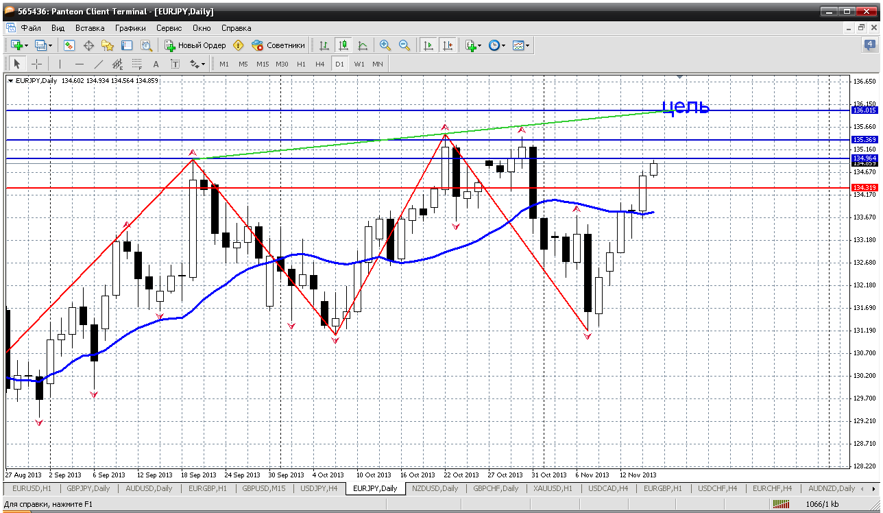 Евройену, пока она не достигнет 136.01 (цель на дневке, тест трендовой) только покупки в приоритете. Но с текущих уже поздновато, цена около сопротивления 134.97. Следующее 135.36. Если есть желание рискнуть, то от этих уровней можно, но со стопами....