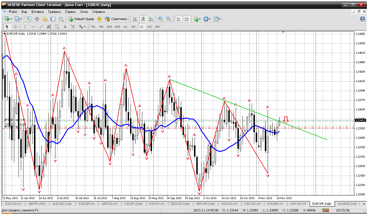 Пара евро-франк. Пока к каком то диапазоне. Либо между трендовыми либо между поддержкой и сопротивлением, выделенных на скрине синими линиями. Диапазон довольно узок и торговать можно, если не ставить "наполеоновских планов". Вот и сегодня продать можно от 1.2342 и взять не более 15 пипсов и в сторону. Такая уж это пара.... Прикрепленные файлы: