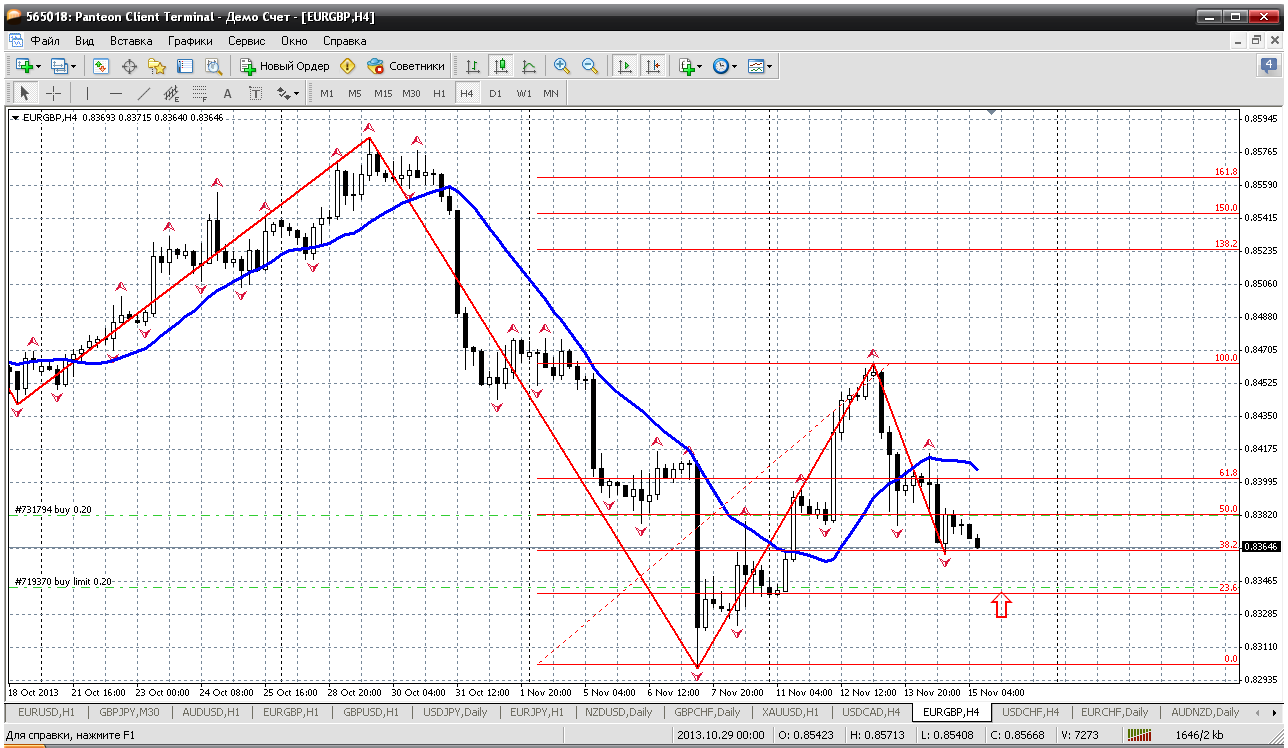 Евро - фунт. Пара меня вчера перехитрила. Только убрал продажу и открыл покупку от 0.8382 (50 % отката по фибоуровням от роста), так пара пошла дальше вниз.... Это уже из области "везет - не везет". План по паре таков: уровень 61.8 % пропускаю, а вот от следующего (76.4%) покупаю. А это получается 0.8341. Попробую усредниться и две сделки вывести в общий "плюс". Прикрепленные файлы: