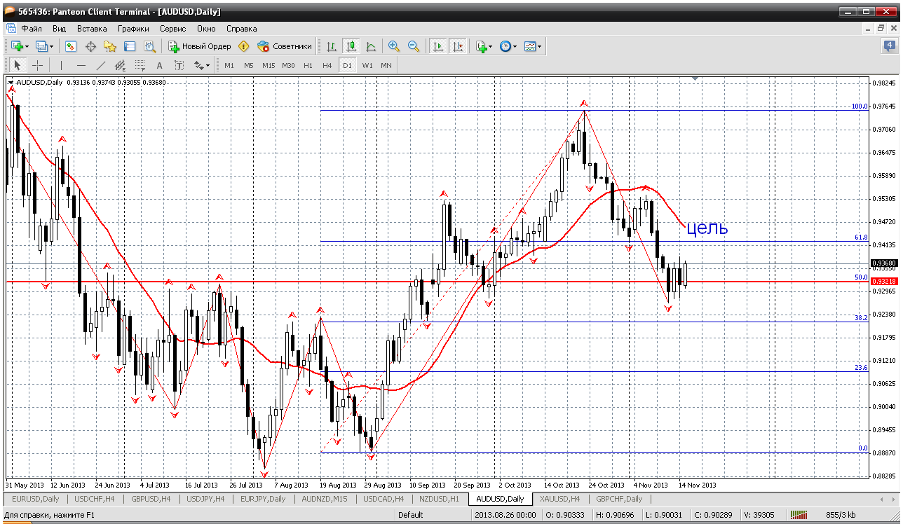 Далее - австралиец. У пары вырисовываются перспективы на севере. Мы видим, 50% откат по фибоуровням сдержал падение цены и пара вроде как начала восхождение. Ближайшее серьезное препятствие на пути роста - дневной мувинг (в районе 0.9470). При его пробое рост пойдет шустрее и вполне возможно обновление локального максимума 0.9757. Прикрепленные файлы: