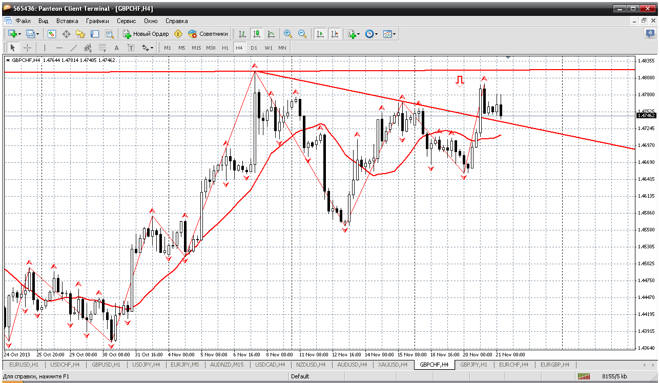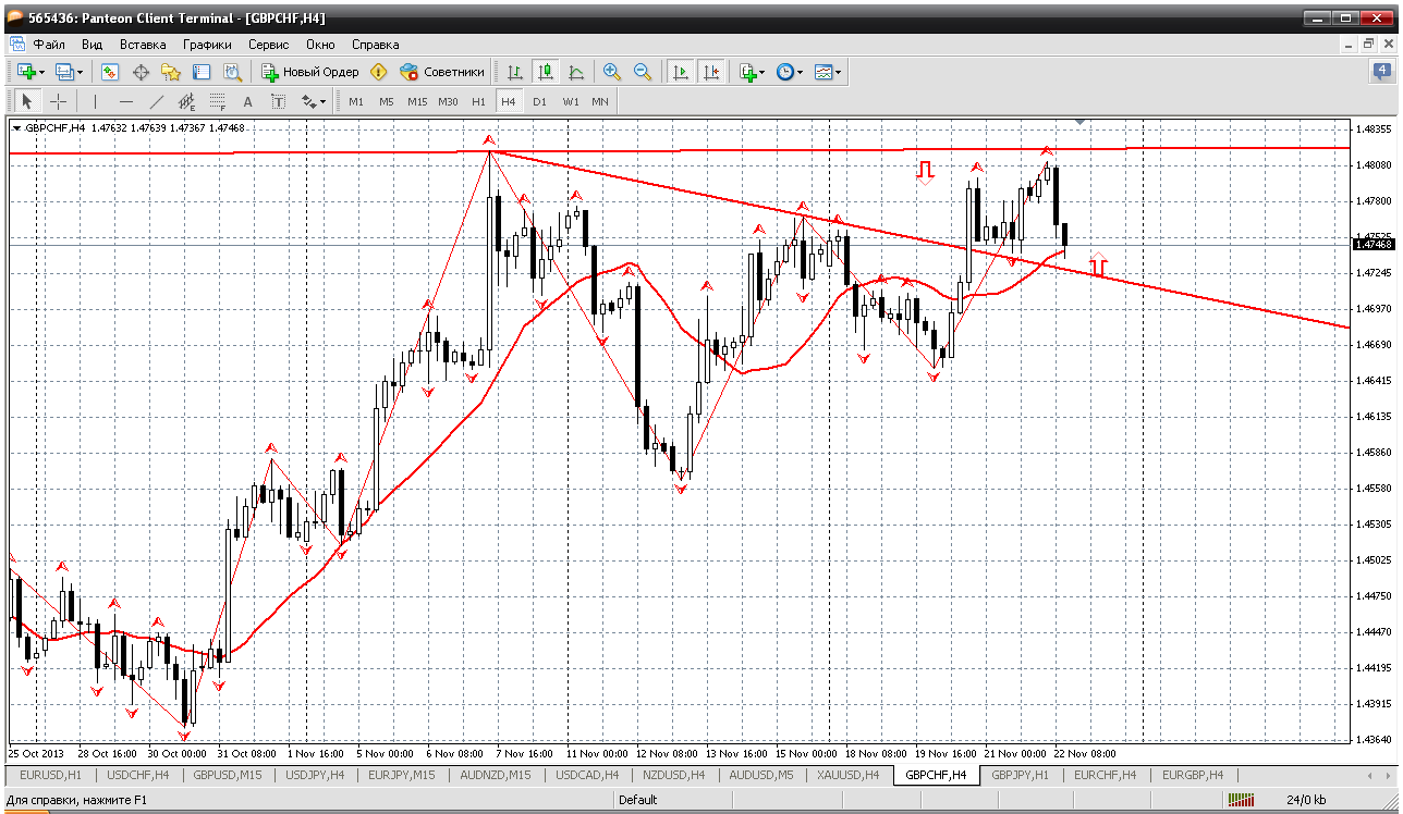 Далее у нас фунт-франк. Пара никак не протестирует дневную трендовую. На сегодня это 1.4822. Вроде пошли на разбег. Получаем откат до 1.4724 и там открываем покупку. Цель уже указал - 1.4822. А вот в продажи вставать, естественно, с этих самых вершков, то есть от 1.4830 где то... Не раньше Прикрепленные файлы: