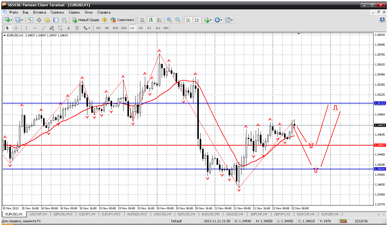 Евробакс. 22.11. Пара скорее всего направилась в фигуру 1.35. С текущих врядли, нужен откат. Вполне достаточно 1.3455 (пивот сегодняшнего дня) от него в рост. Цель 1.3511...