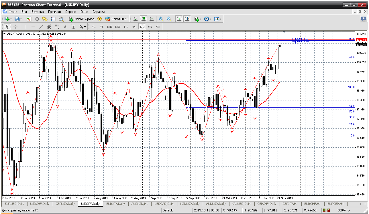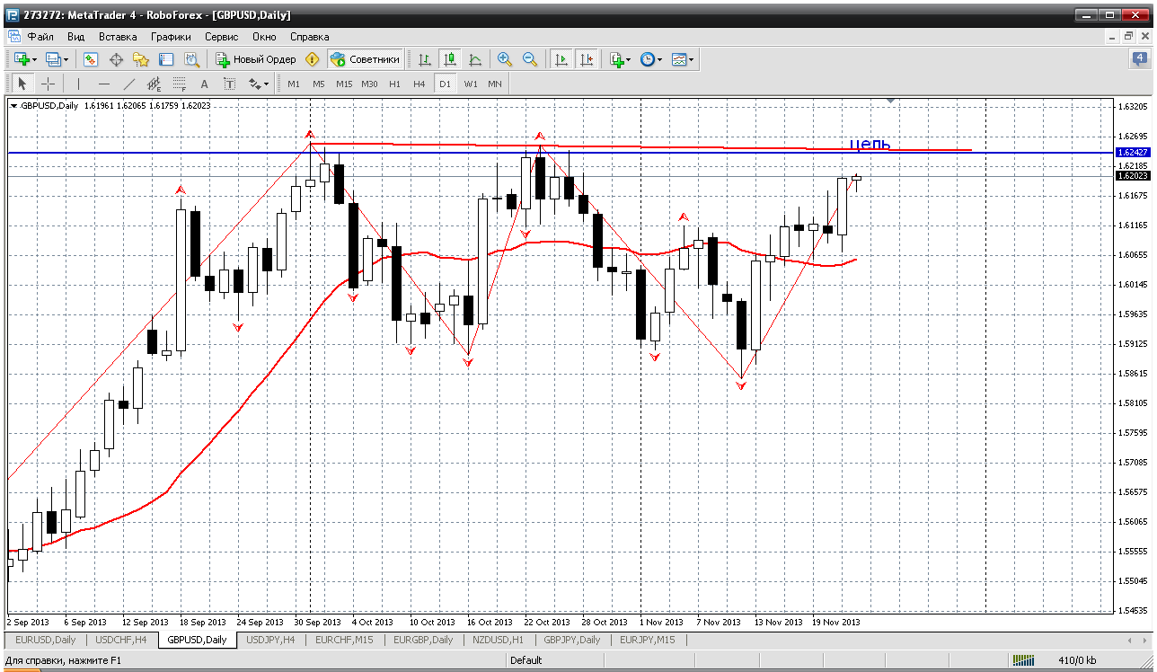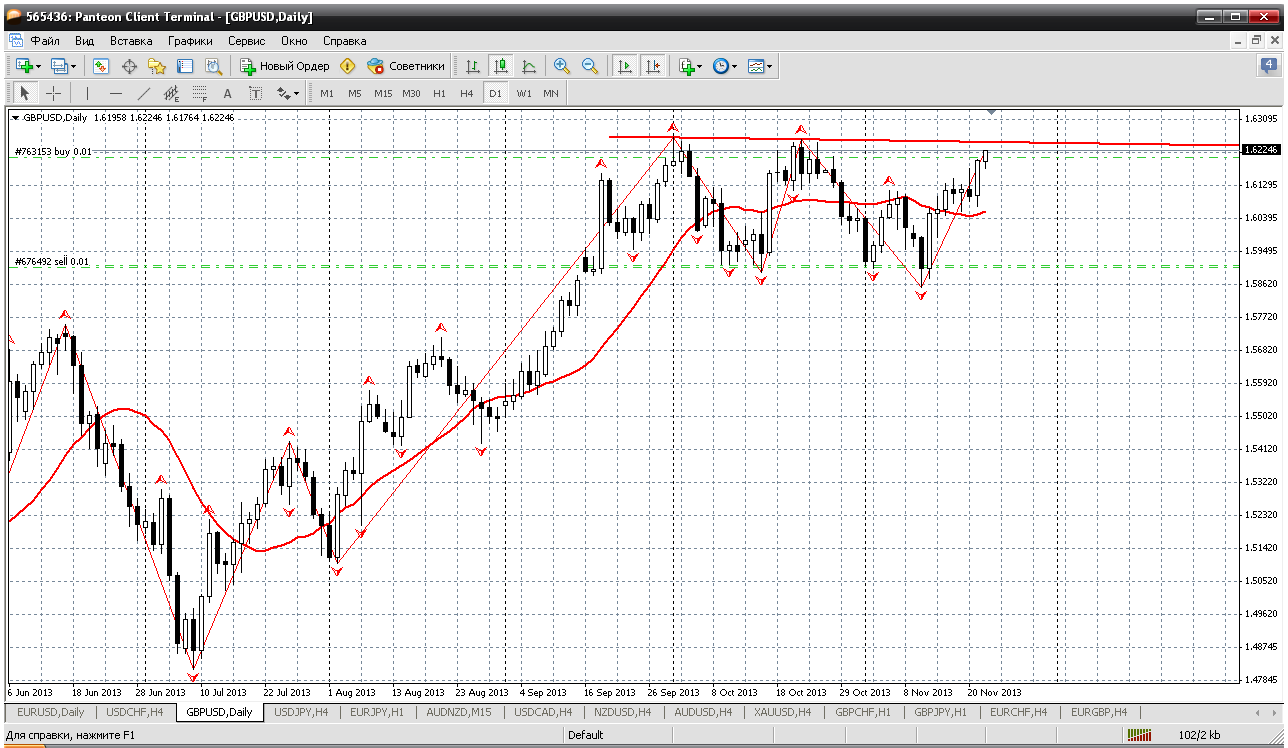 Фунтобакс. У него цель совсем рядом 1.6243 и другой нет. Я так думаю. Верхняя граница дневного диапазона, практически максимумы 2013 года. Я думаю, что цену 1.6338 от 2 января в расчет можно не брать. Поэтому планы по фунту по дневному ТФ: от 1.6243 начинать продажи, при уходе цены выше - добавляться. Я думаю, что все равно уйдут ниже и год будет закрыт (может тороплюсь с выводами) ниже указанного уровня 1.6243. Прибыль будет Прикрепленные файлы: