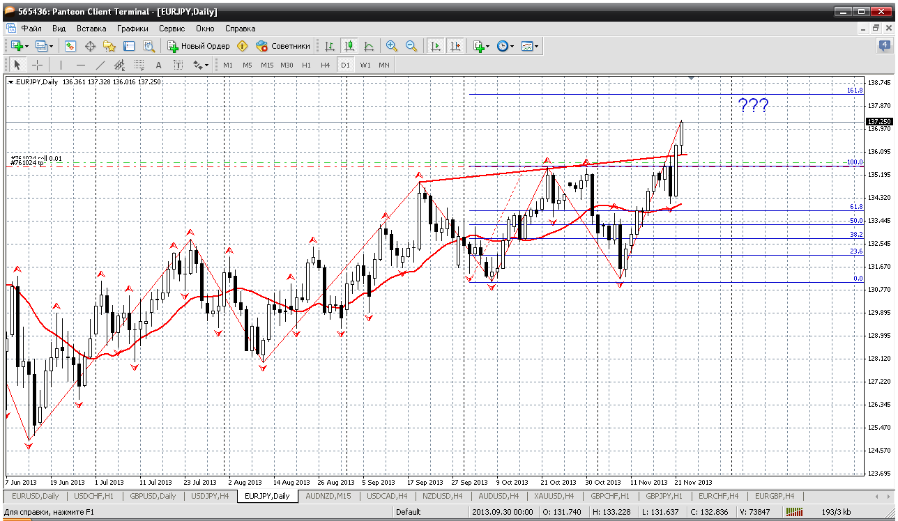 Далее - евройена. По этой паре пока своего мнения не меняю - вне рынка. Тренд, а это тупое, безжалостное к сливу, движение. Пара пробила и закрепилась выше всего, что только есть. Тут некоторые коллеги предложили глянуть на 2009 год (последний раз цена была на этих уровнях именно тогда), но я так через года не анализирую... Можно только по фиборасширению на дневке. Получается 138.30. Как то так. Лучше со стороны понаблюдать за этим безобразием. Прикрепленные файлы: