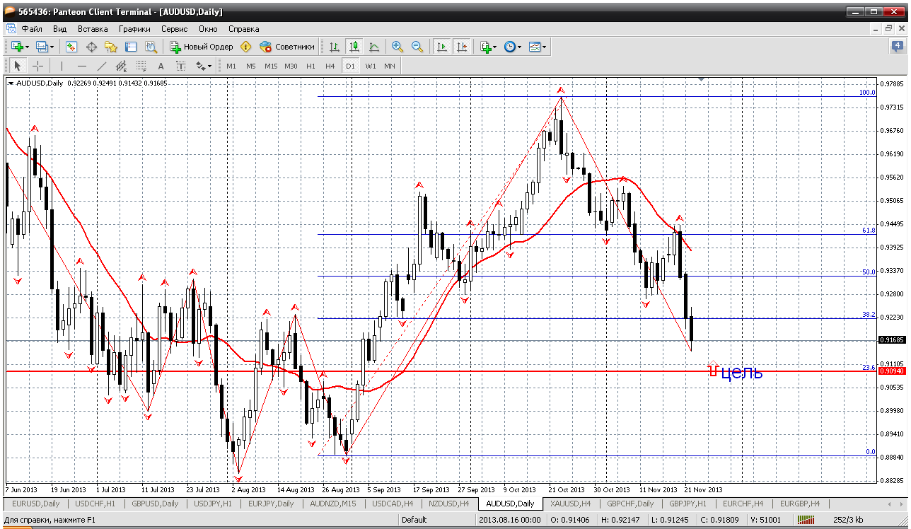 Австралиец. Некоторые уже ждут роста пары с текущих. А я думаю, что не надо торопиться. пара закрепилась ниже уровня 61.8 отката на дневном ТФ. Теперь, скорее всего, будет тест следующего уровня 76.4. А это у нас 0.9094 и только от него возможен рост. И то, австралиец может подумать, что он мажор, вернее вспомнить, и за компанию с евровалютами (снижение которых я жду на следующей неделе), снизиться против бакса еще ниже...Так что осторожней. Прикрепленные файлы: