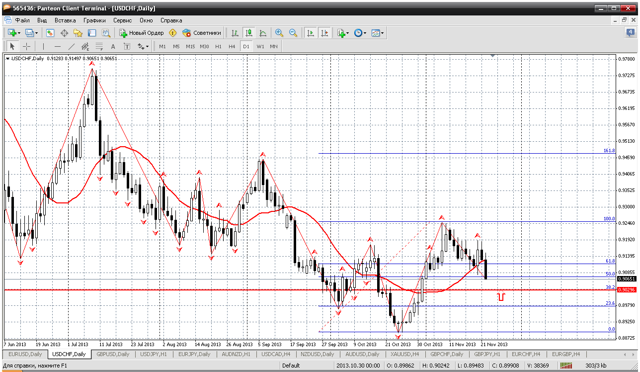 Далее. Доллар - франк. Здесь зреет рост и рост довольно приличный. На дневном ТФ видно основное движение на рост. Поясню. Движение от 0.8890 до 0.9249 пробило предыдущую вершинку на зиг - заге (было 0.9178). И даже цена закрытия дня была выше 0.9178. Поэтому снижение на прошедшей неделе есть ничто иное, как откат, перед предстоящим ростом. Получается, 50% пробили, идем к 61.8 % по фибо и от 0.9029 пару можно начинать покупать... Прикрепленные файлы:
