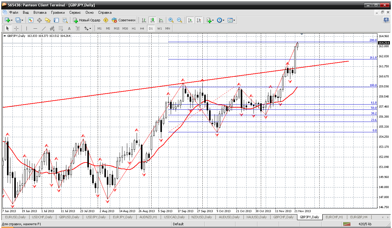 Фунто-йена. Здесь практически ситуация повторяет евро-йену. Тоже все уровни и каналы по паре пробиты и тяжко привязать цену к чему бы то ни было, очень сложно. Последний раз цена была на этих уровнях в кризисном 2008 году, в октябре месяце. Так то. Остается упражняться в теоретических расчетах по паре. И получается, что рост достиг уровня 200% по фиборасширению. И пару можно продавать с текущих, если что, пипсов через 150 добавляться и т.д. Снижение будет обязательно... Прикрепленные файлы: