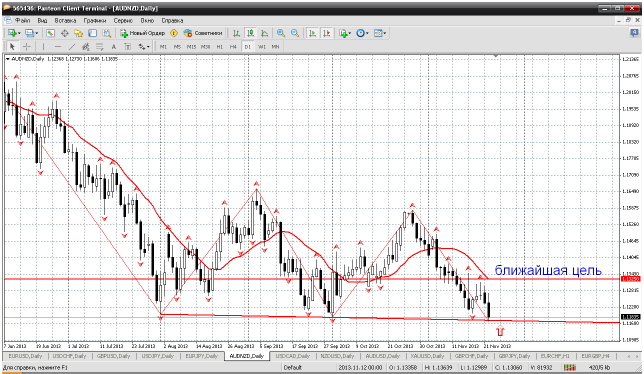 Далее, наша тихоокеанская пара, Австр - НЗД. По которой что либо увидеть меньше чем на дневке, проблематично. А вот сейчас именно ситуация на дневном ТФ. Сейчас цена как раз легла на трендовую линию на дневном ТФ. Считаю от этого уровня покупать уже можно. Довольно безопасная ситуация. Ну и стоп лос можно выставить не сильно большой. Но я бы не стал ставить его, может хвостом задеть, а потом вверх, но уже без нас... Прикрепленные файлы: