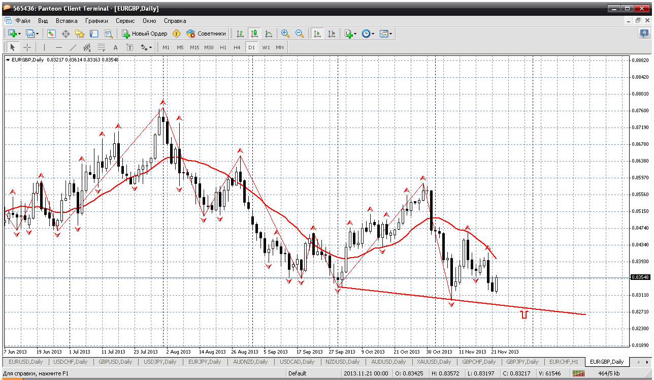 Далее, евро - фунт. Пару давно покупаю по сигналам на Н4. Но не идет цена выше мувинга на дневном ТФ. И куда она собралась то на дневке? Получается хочет поддержку протестировать на дневном ТФ. У меня получается, что ход вниз может еще продолжится до 0.8280-0.8290. Там трендовая приличная, от неё вполне вероятно начало роста. Я так думаю. Прикрепленные файлы: