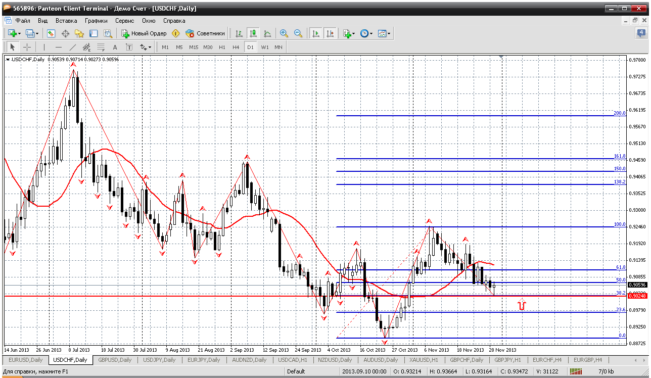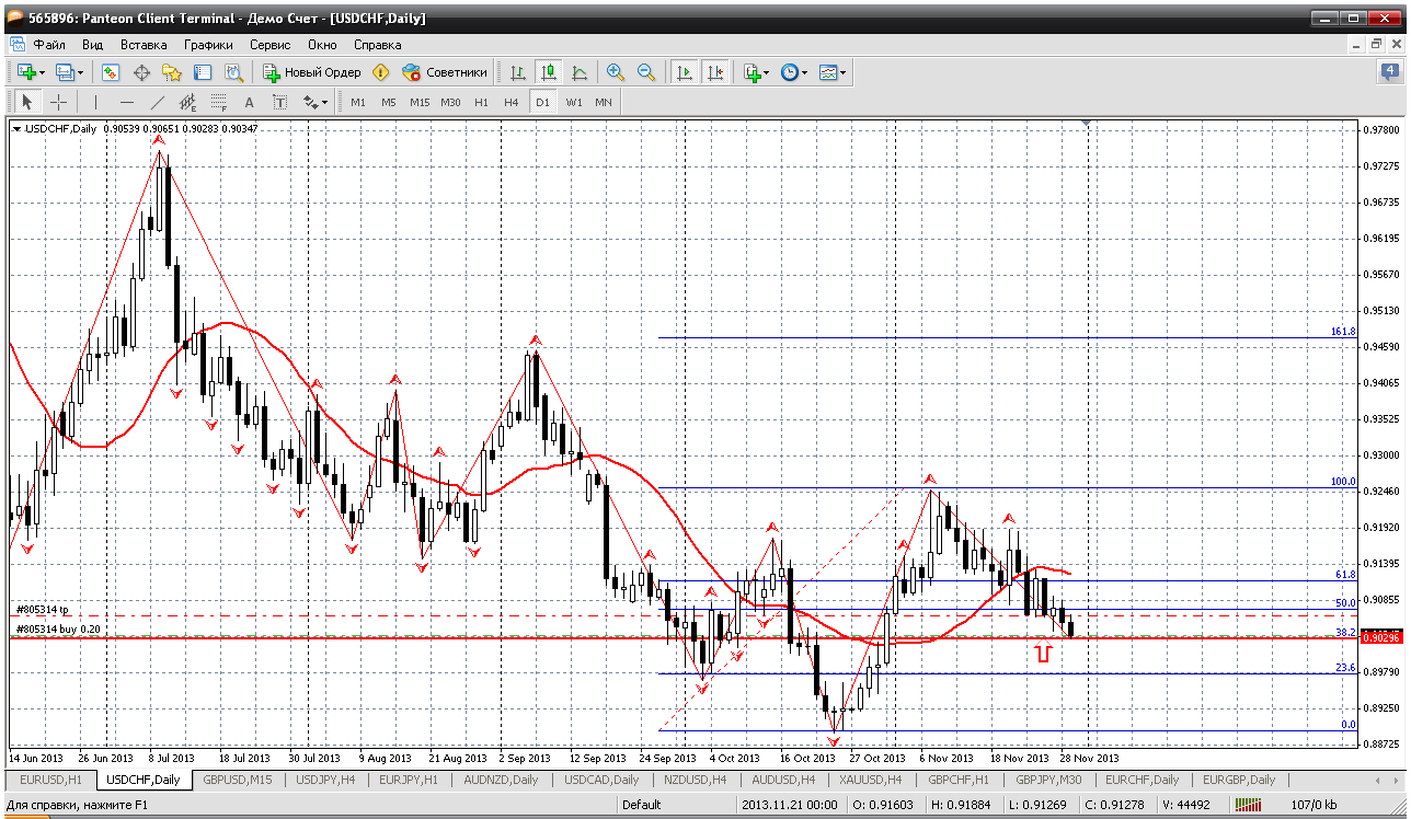 Доллар-франк я уже писал в пятницу, что пришли к очень серьезному уровню на дневном ТФ. Там у нас основное направление вверх: вершина 0.9245 выше предыдущей и сейчас идет откат. Вот цена и достигла приличного уровня 61.8 по фибо и теперь вверх. В пятницу чуток пробовал - получилось. Тут покупки можно и надолго зарядить. Вот фунт только успокоится в своем росте... Прикрепленные файлы: