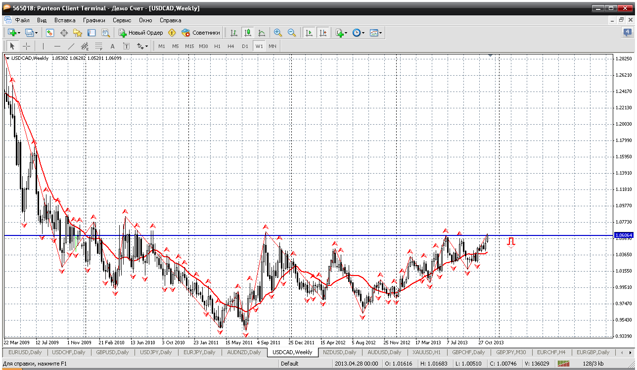 Далее - канадец. Вот уж против кого бакс американский себя превосходно чувствует и вот видно к какому "водоразделу" подошла цена: все что выше 1.0606 и все что ниже. Так вот если закрепляемся выше - то путь к 1.10 будет открыт. Но я думаю, что пока рановато о таких высотах говорить. Поэтому, скорее всего, на предстоящей неделе продажи и еще раз продажи по паре. Прикрепленные файлы: