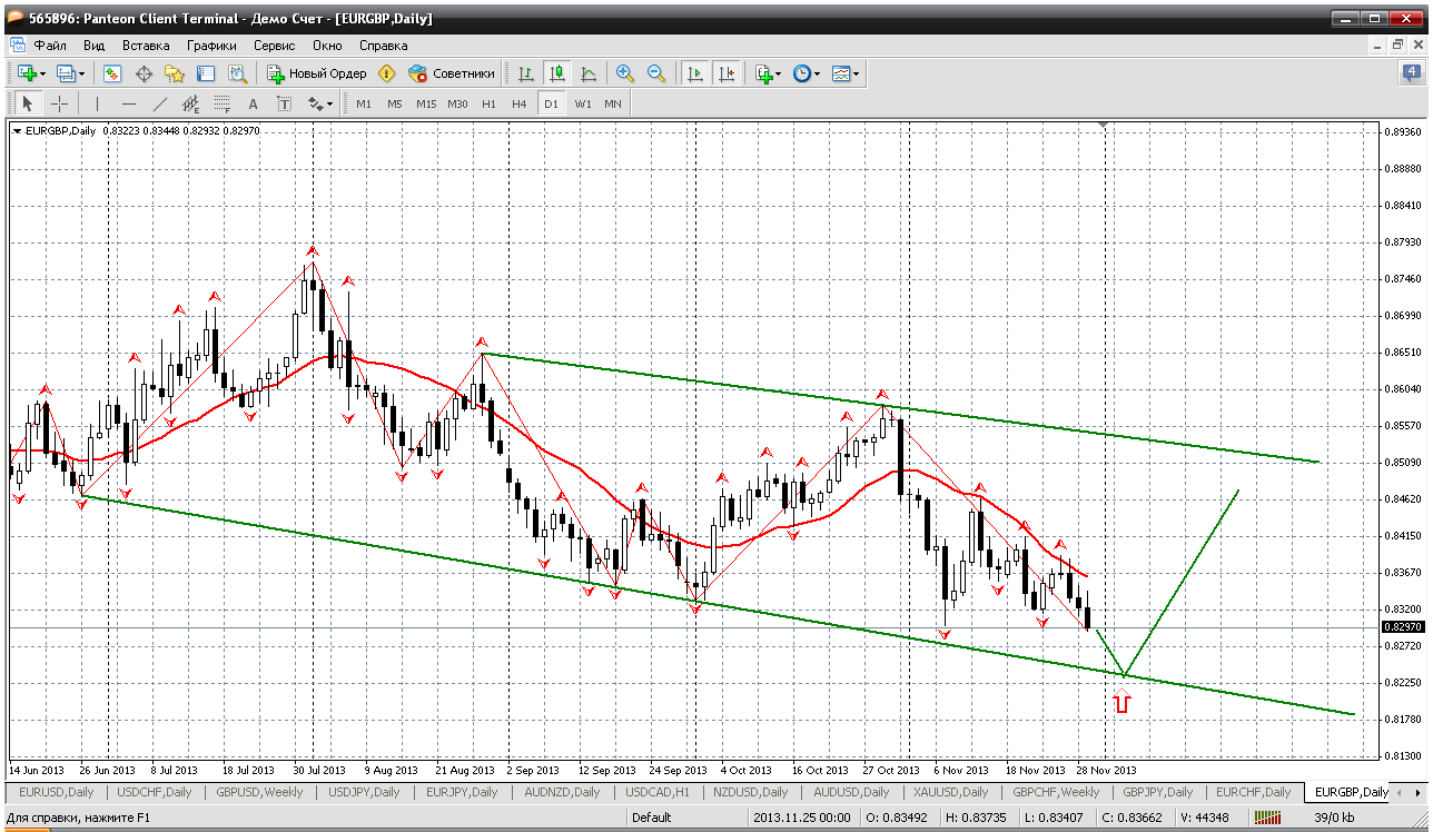 Далее - евро-франк. Очень малоподвижна пара была в ноябре. Цена зажата в треугольнике и диапазон был всего 70 пипс. Сейчас цена находится у верхней границы треугольника, но при этом ниже мувинга. Поэтому считаю, что ближайшие перспективы пары внизу и поэтому приоритет продажам. Цели 1.2270 Прикрепленные файлы: