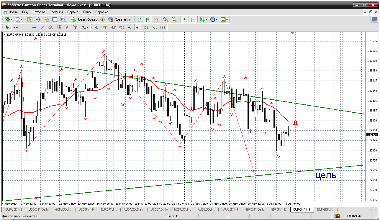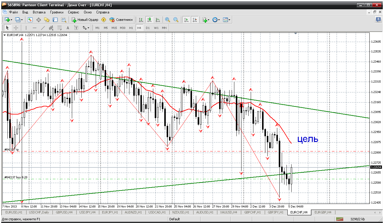 Далее евро - франк. Вчера без всяких откатов и высот пошла вниз, к обозначенным целям. Но без меня, я ждал 1.2302. Так вот сегодня решил не мудрить, а просто с текущих, от уровня поддержки прикупить. От 1.2260 купил пару. Цели вырисовываются в районе 1.2287 (тест мувинга на Н4). И это как минимум. Очень вероятен поход в фигуру 1.23. Вполне реально. Прикрепленные файлы: