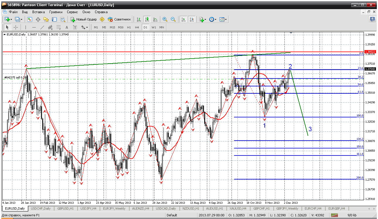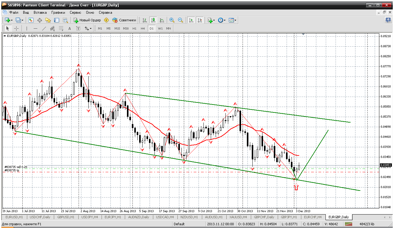 Далее у меня евро - фунт. Я при любом, даже незначительном росте, пару продаю. Вчера продал. Сегодня при заходе в фигуру 0.83 сразу открыл короткую позицию. А цели жду еще ниже, в районе 0.8235 примерно (на скрине зеленая линия, это трендовая на дневке). Поэтому так смело и продаю. Пара то очень техничная. Прикрепленные файлы: