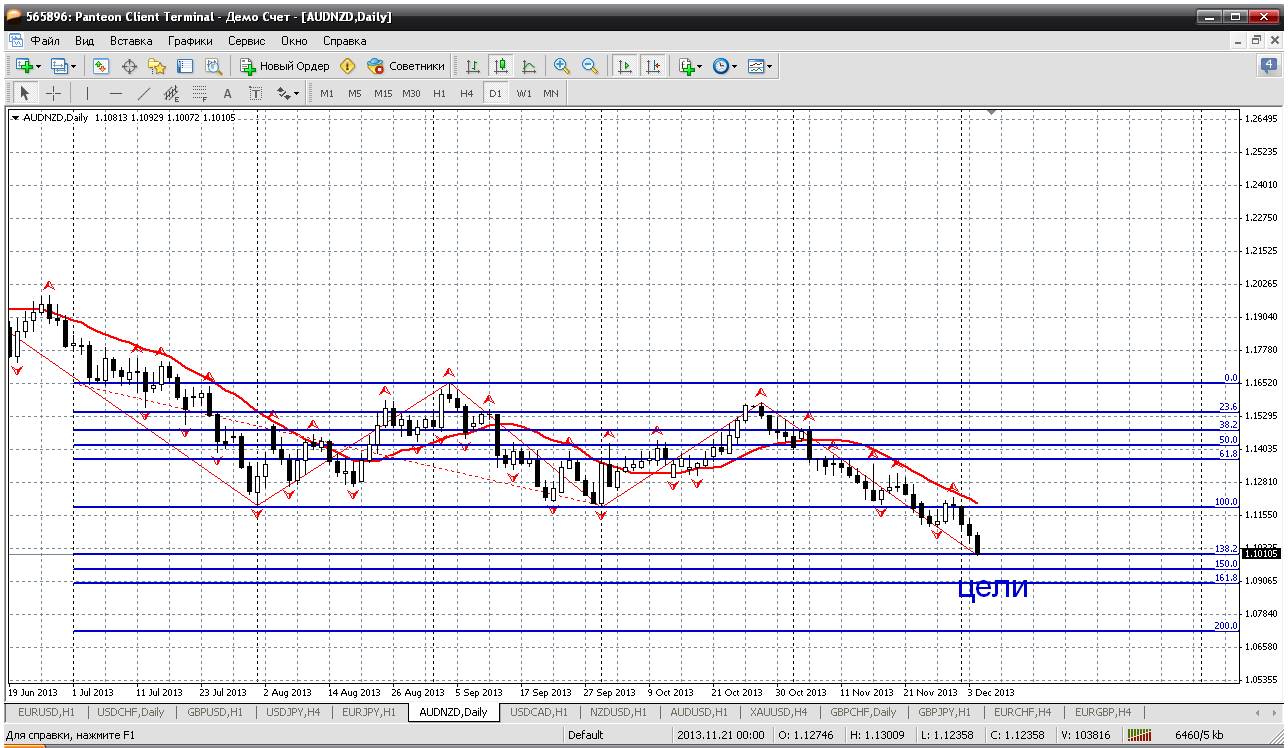 Австралиец - НЗД. По этой паре все тот же тренд, все теже юга. После пробития парой уровня 1.1190-80 движение вниз пошло более быстрыми темпами. И ожидать начало коррекции, я думаю, надо уже ниже 1.10. По фиборасширению может быть три уровня: от 138.2 до 161.8 и откуда пара и соизволит откорректироваться. Пока себе определил район 1.0950, а там видно будет.... Прикрепленные файлы: