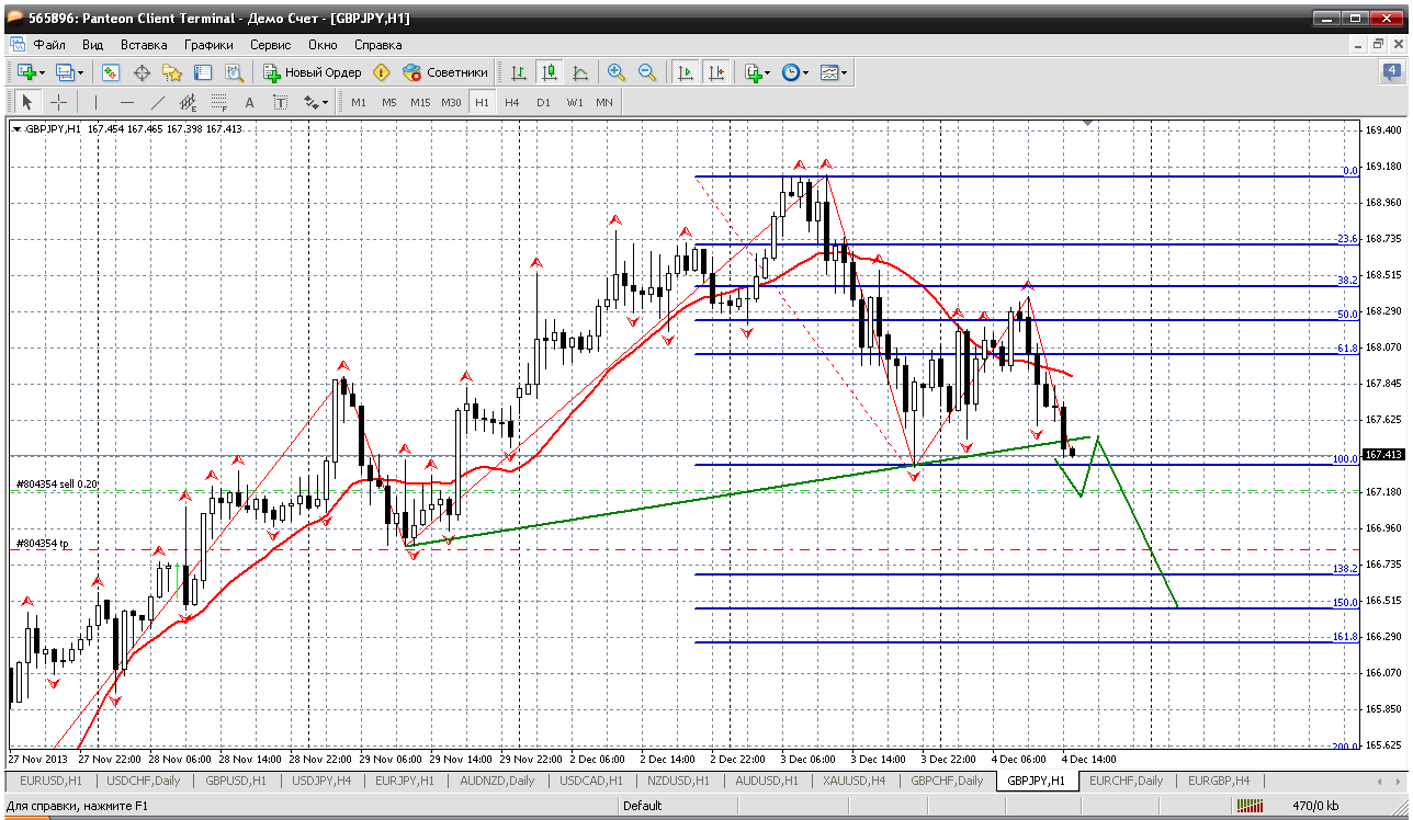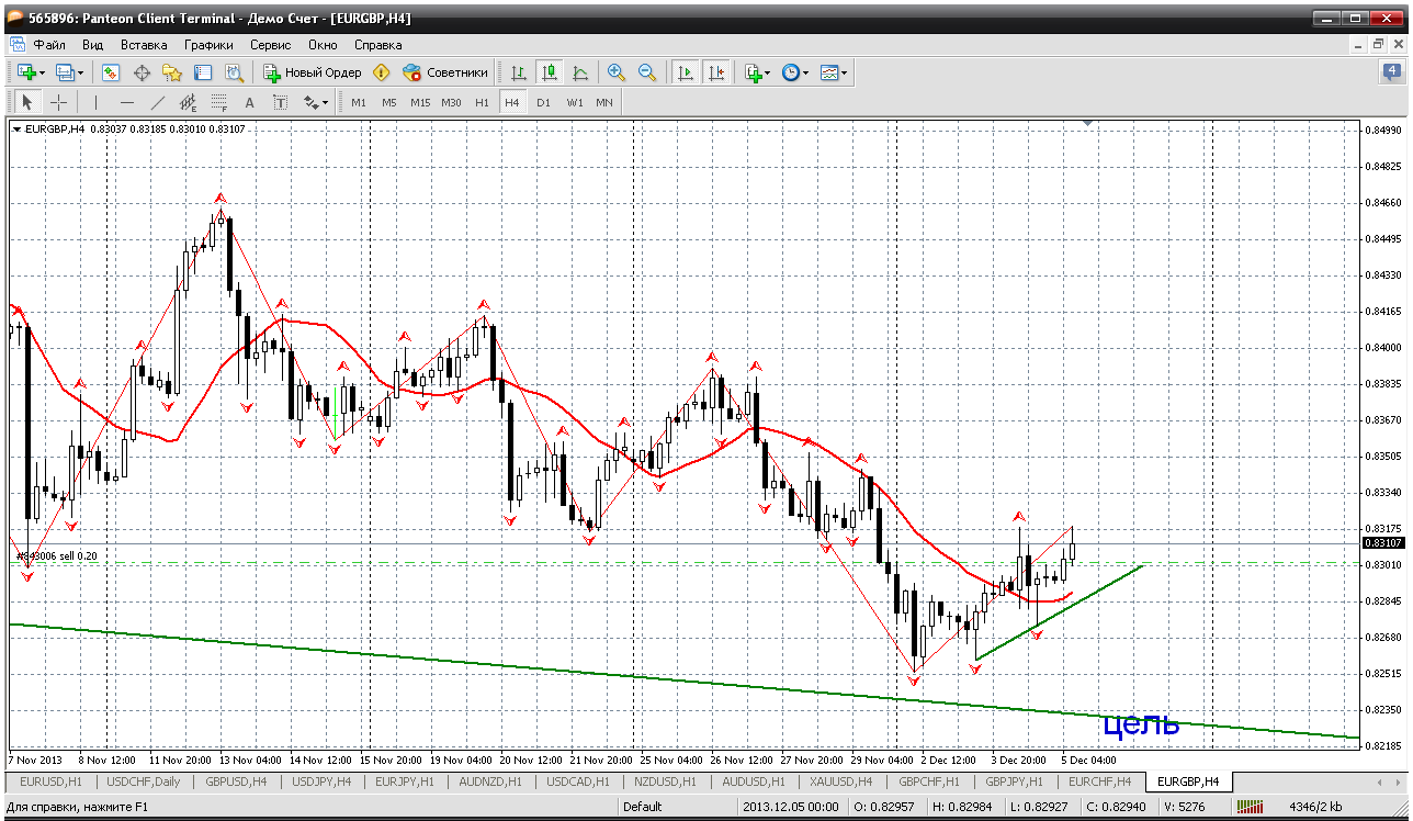 Далее - евро - фунт. Вроде тренд на юг по паре и я верил в достижение целей у нижней границы канала 0.8237. И исходя из этого открыл продажу от 0.8290, при тесте мувинга на Н4. Но как всегда рынок преподносит сюрпризы и мувинг был пробит и цена ушла в фигуру 0.83. Но думаю, что это ненадолго. Считаю, что цели внизу, на 0.8237 будут достигнуты. Прикрепленные файлы: