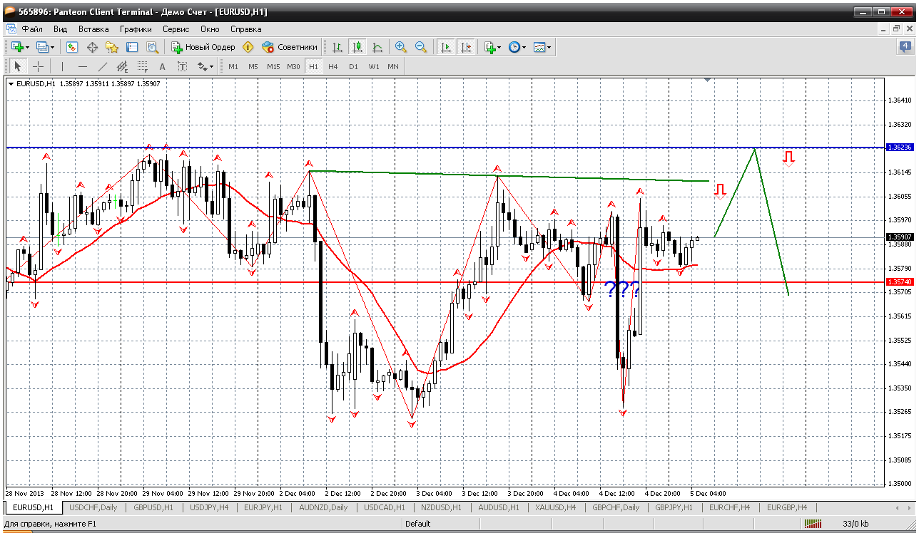 А сегодня, 5.12. такой расклад получается: сейчас пробуем покупать. Ход в сторону 1.3611 (трендовая на Н1) или даже 1.3623 (первое сопротивление). А с тех уровней в продажи. Сначала до 1.3575 (пивот) и далее 1.3546 (поддержка). ПС: календарь прямо красный от важных новостей Прикрепленные файлы: