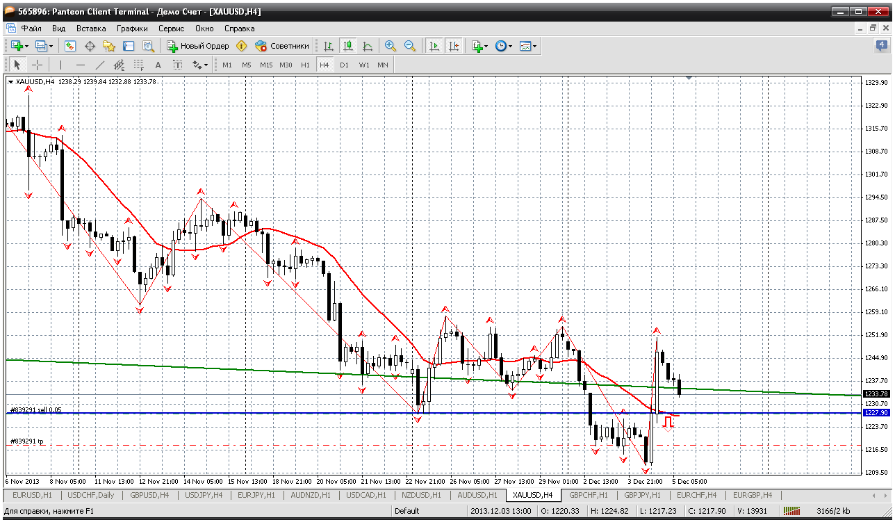 Далее...золото. Этот инструмент у нас в жестком тренде. Идет снижение и снижению завершения не видно. Поэтому попробую сегодня поработать по тренду и продать. Но я не любитель продавать с текущих, Поэтому надо бы подождать отката, примерно до 1227.90...это возврат к мувингу на Н4 и предыдущий локальный минимум. Думаю, получится. Прикрепленные файлы: