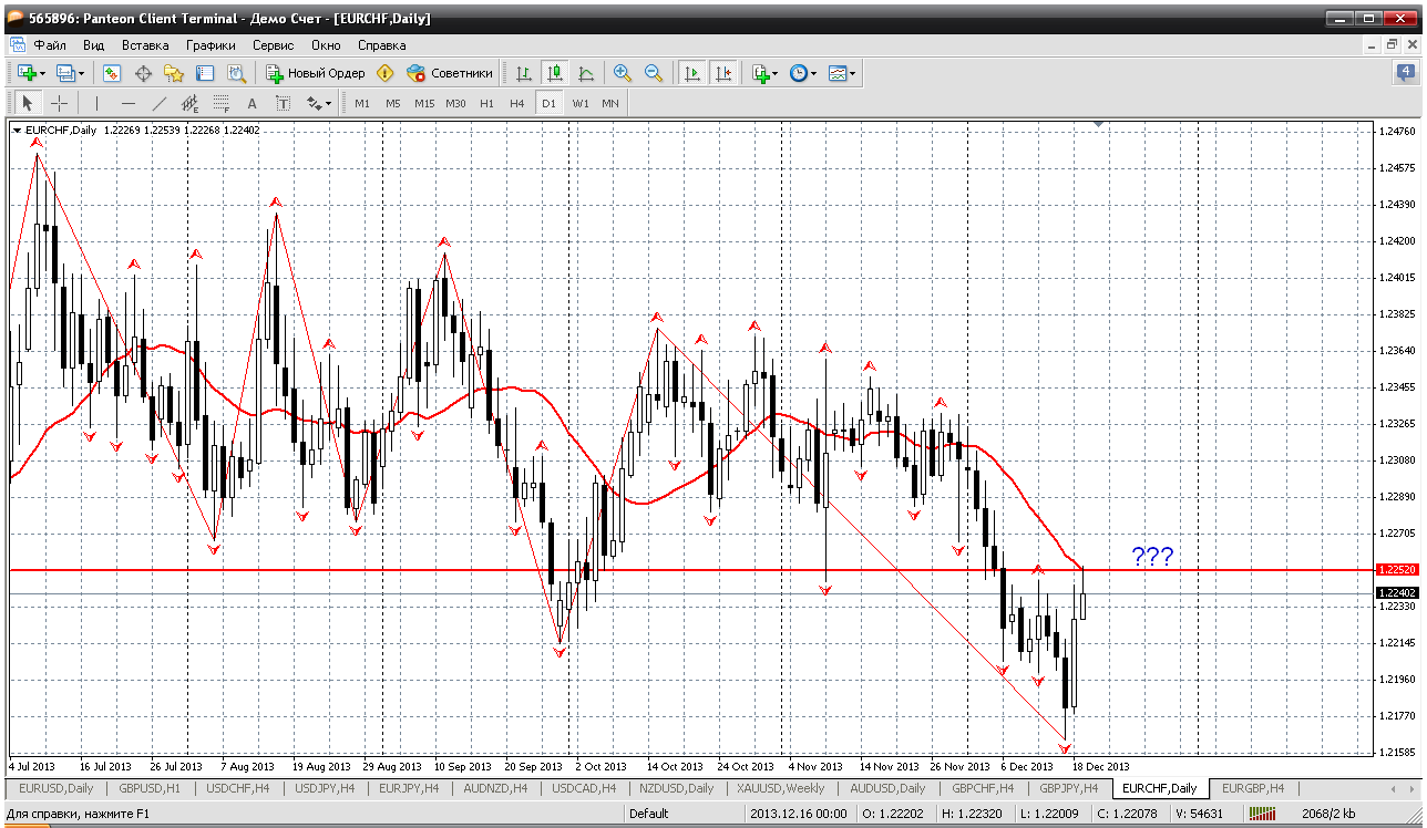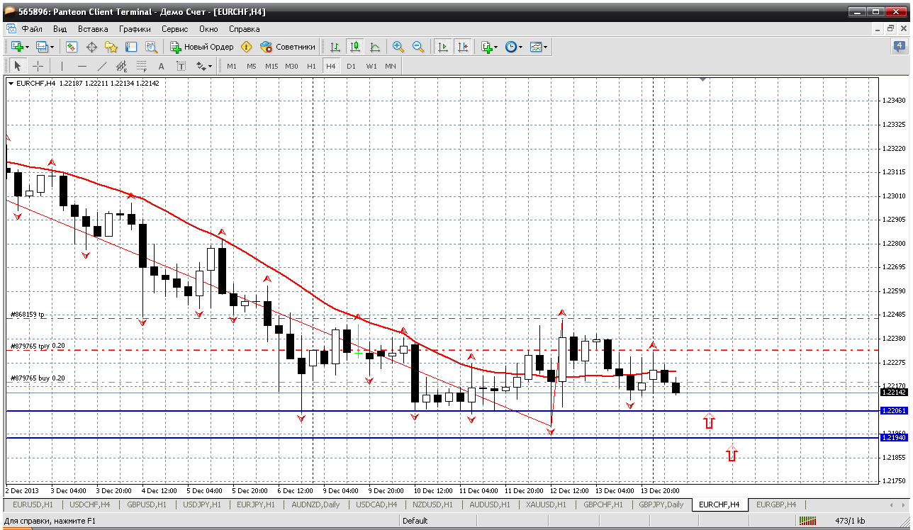 Далее - еврофрнак. по этой паре все покупки закрылись и хотя по прежнему, жду 1.23 пока новых позиций открывать не буду. Сейчас цена подошла к мувингу на дневном ТФ и поэтому наверное пойдет на коррекцию. И тогда, где нибудь поближе к 1.2220 опять буду возобновлять покупки. А пока, на забор. Прикрепленные файлы: