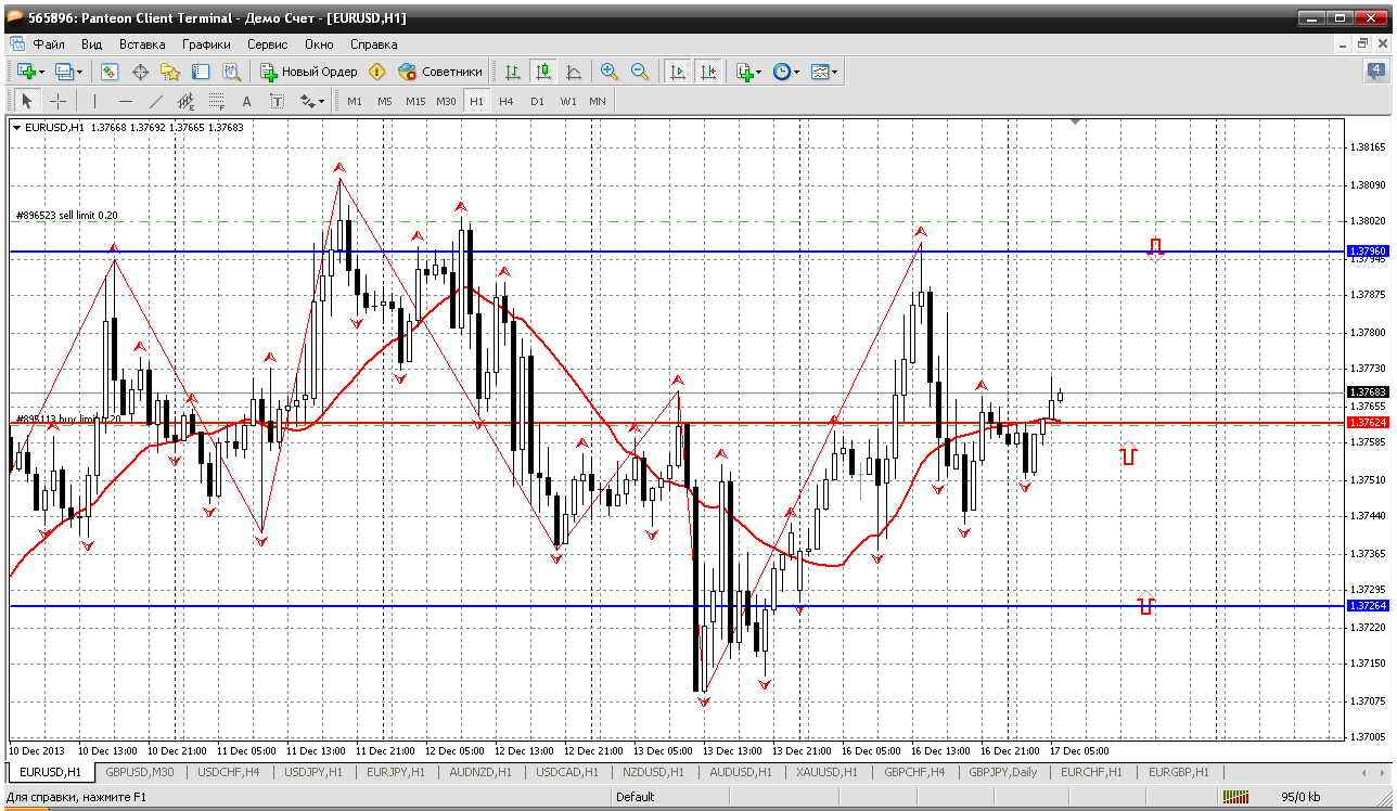 Евробакс. 17.12. Думаю и сегодня больших движений не увидим. Торговля в коридоре (диапазон). А его границы довольно далеко от текущей цены: сопротивление ближайшее 1.3796 , от него продаем