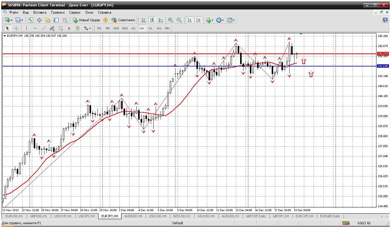 Евройена...Йеновые пары никак не угомонятся. Все вверх смотрят. Вот и сегодня пару надо покупать. Причем, практически без отката, хоть с текущих. При этот 142.27 пивот сегодняшнего дня и цена как раз выполнила возврат к нему. Но можно подождать отката к поддержке, 141.64 и уже оттуда совсем безопасно купить. Но...есть одно "НО". Можем не увидеть такой глубины. Прикрепленные файлы: