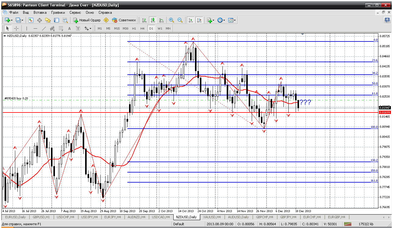 Далее - новозеландец. По паре вот что получается. В данный момент цена ушла ниже мувинга на дневном ТФ и если день так же и закроют, то у нас образуется приличный сигнал на дальнейшее снижение пары. Может начаться отработка зиг-зага вниз (на 1-2-3) с ближайшей целью 0.8090. Во как... Прикрепленные файлы: