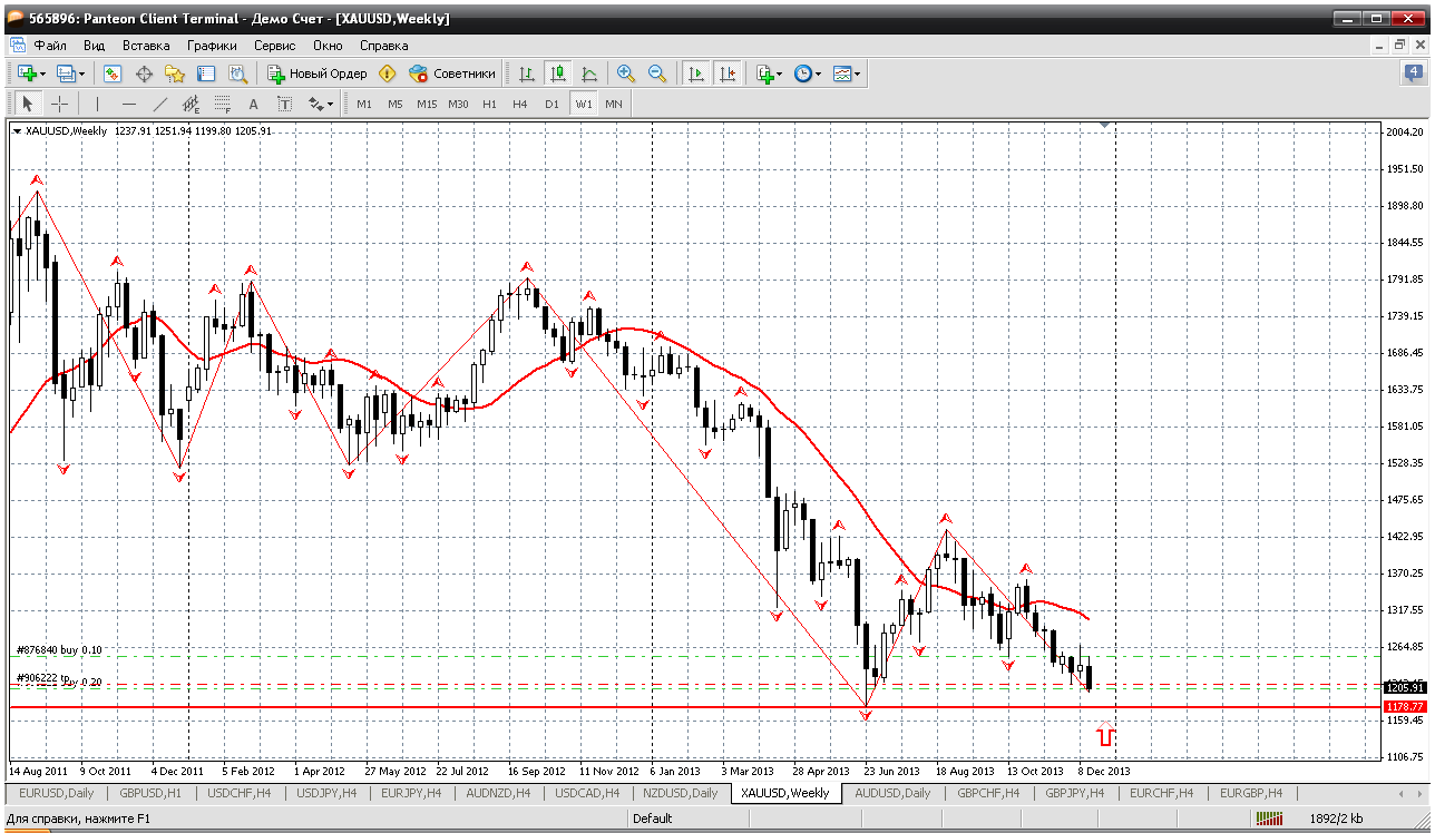 Золото на очереди. По этому инструменту картина наиболее яркая - на недельном ТФ. На других, меньших графиках висит ужасный и непоколебимый тренд. А вот на недельном хорошо видно к какому важному уровню поддержки мы подходит. В принципе и сам уровень 1200 вполне пригоден для покупок. Тут и объяснять не надо - покупаю. Прикрепленные файлы: