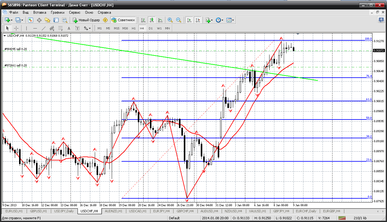 Рост баксофранка вроде как "выдыхается". На Н4 видно хорошо, что цена достигла некоего барьера и без отката его не пройти. Поэтому продать можно хоть с текущих 0.9107. И ближайшая цель отката 0.9050 (возврат к пробитой трендовой на дневке и 23.6% отката по фибо). Можно попробовать. Прикрепленные файлы: